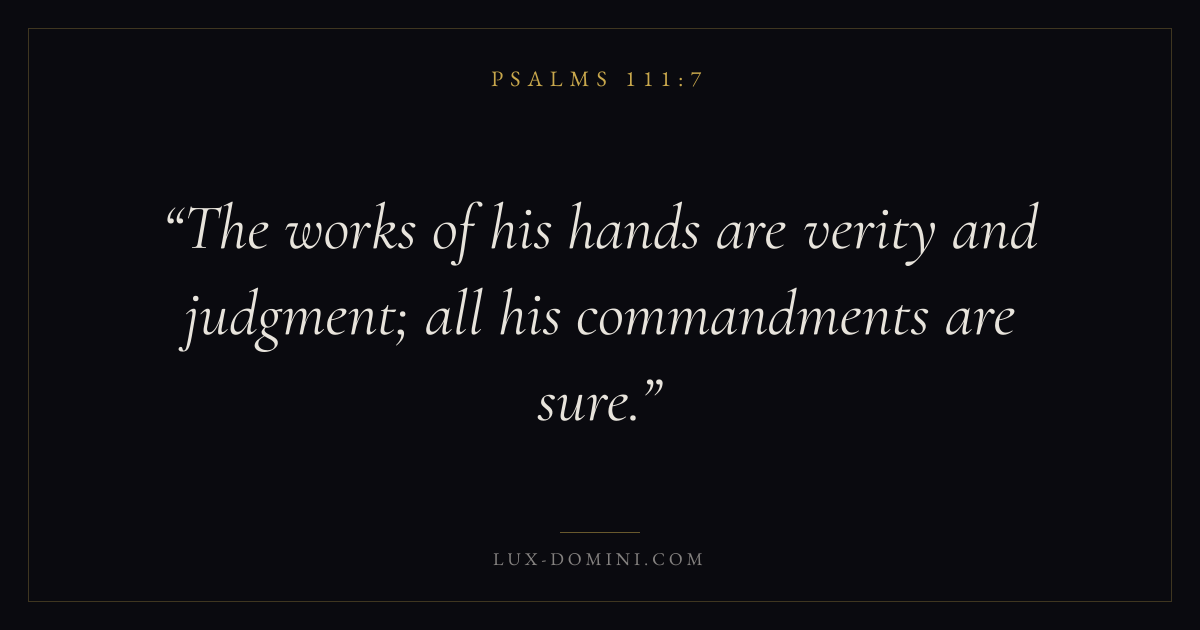 Books / Psalms / Chapter 111 / Verse 7 ← Psalms 111:6 Psalms 111:7 Psalms 111:8 → The works of his hands are verity and judgment; all his commandments are sure. Download verse card Share on Twitter Share on Facebook Pin it ✦ Key themes FaithPrayerJustice and mercyPraise Read with Hebrews 11:1Romans 10:17Matthew 6:9Luke 18:1 Related topics Bible verses about faithBible verses about prayerBible verses about justice and mercyBible verses about thankfulness and gratitude ✦ Psalms Chapter 111 verses V. 1 V. 2 V. 3 V. 4 V. 5 V. 6 V. 7 V. 8 V. 9 V. 10