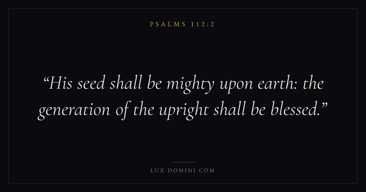 Books / Psalms / Chapter 112 / Verse 2 ← Psalms 112:1 Psalms 112:2 Psalms 112:3 → His seed shall be mighty upon earth: the generation of the upright shall be blessed. Download verse card Share on Twitter Share on Facebook Pin it ✦ Key themes FaithPrayerPraiseLament Read with Hebrews 11:1Romans 10:17Matthew 6:9Luke 18:1 Related topics Bible verses about faithBible verses about prayerBible verses about thankfulness and gratitudeBible verses about grief and loss ✦ Psalms Chapter 112 verses V. 1 V. 2 V. 3 V. 4 V. 5 V. 6 V. 7 V. 8 V. 9 V. 10