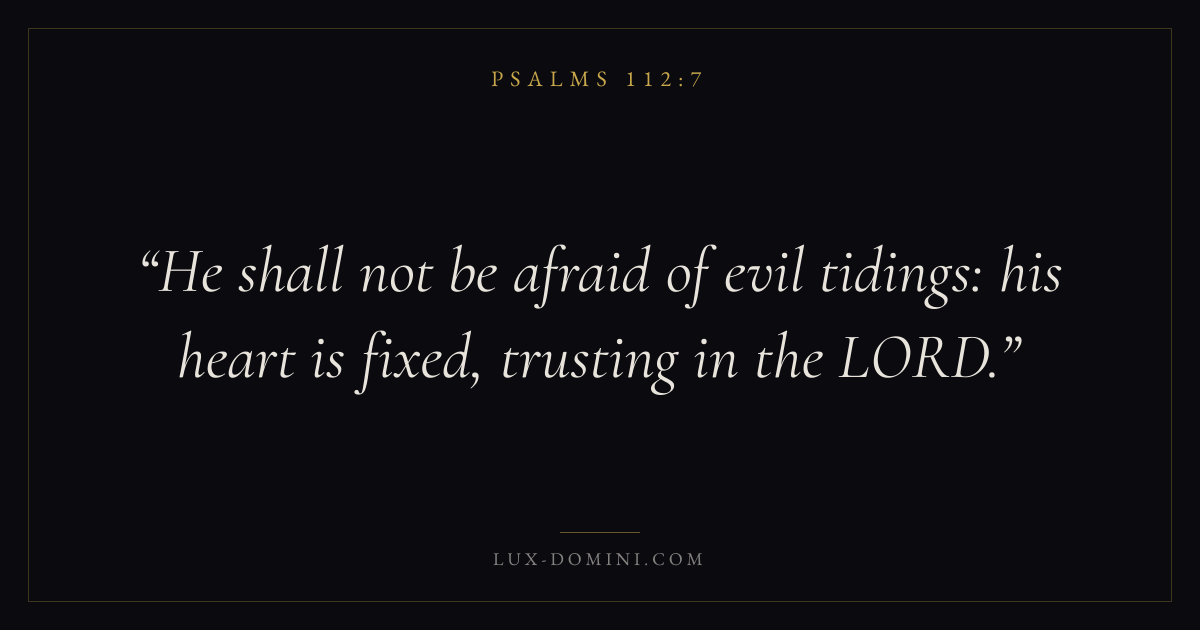 Books / Psalms / Chapter 112 / Verse 7 ← Psalms 112:6 Psalms 112:7 Psalms 112:8 → He shall not be afraid of evil tidings: his heart is fixed, trusting in the LORD. Download verse card Share on Twitter Share on Facebook Pin it ✦ Key themes FaithAnxiety and fearPrayerPraise Read with Hebrews 11:1Romans 10:17Philippians 4:6Isaiah 41:10 Related topics Bible verses about faithBible verses about anxiety and fearBible verses about prayerBible verses about thankfulness and gratitude ✦ Psalms Chapter 112 verses V. 1 V. 2 V. 3 V. 4 V. 5 V. 6 V. 7 V. 8 V. 9 V. 10