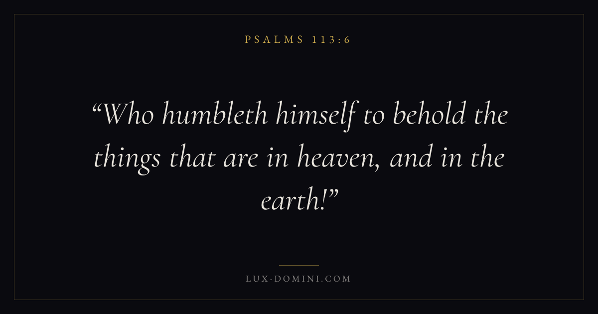 Books / Psalms / Chapter 113 / Verse 6 ← Psalms 113:5 Psalms 113:6 Psalms 113:7 → Who humbleth himself to behold the things that are in heaven, and in the earth! Download verse card Share on Twitter Share on Facebook Pin it ✦ Key themes FaithPrayerPraiseLament Read with Hebrews 11:1Romans 10:17Matthew 6:9Luke 18:1 Related topics Bible verses about faithBible verses about prayerBible verses about thankfulness and gratitudeBible verses about grief and loss ✦ Psalms Chapter 113 verses V. 1 V. 2 V. 3 V. 4 V. 5 V. 6 V. 7 V. 8 V. 9