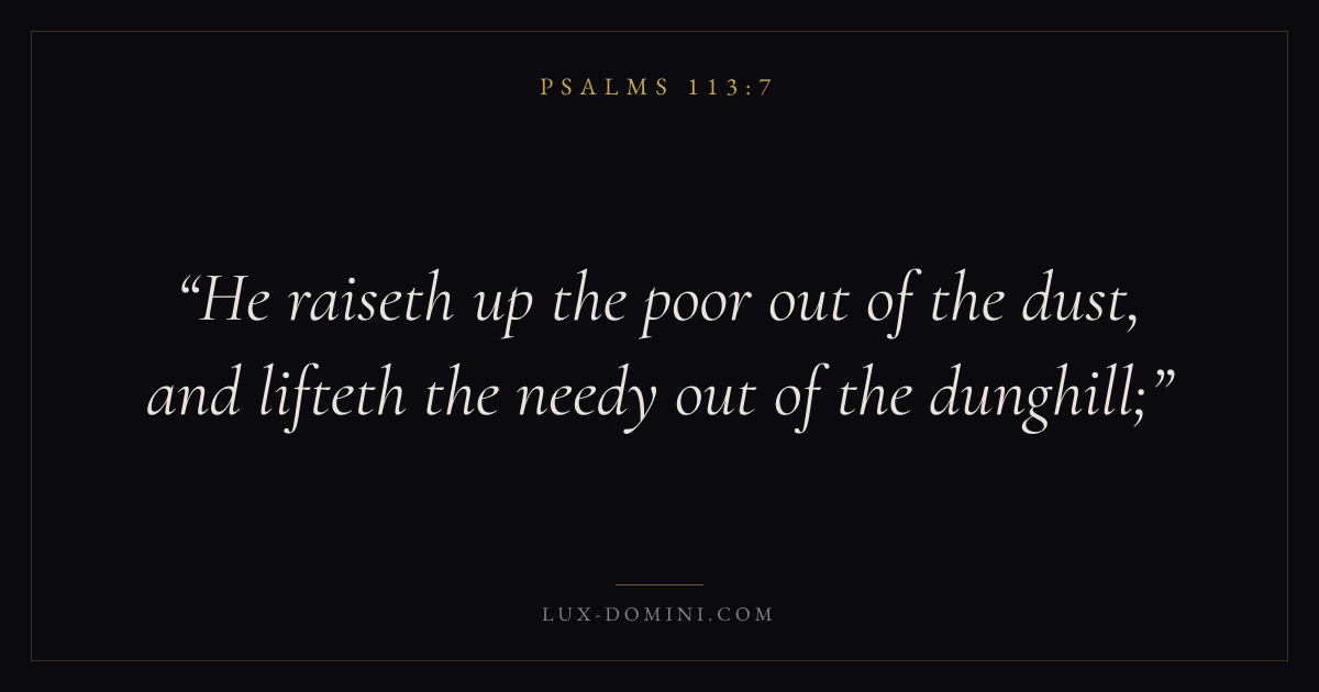 Books / Psalms / Chapter 113 / Verse 7 ← Psalms 113:6 Psalms 113:7 Psalms 113:8 → He raiseth up the poor out of the dust, and lifteth the needy out of the dunghill; Download verse card Share on Twitter Share on Facebook Pin it ✦ Key themes FaithPrayerJustice and mercyPraise Read with Hebrews 11:1Romans 10:17Matthew 6:9Luke 18:1 Related topics Bible verses about faithBible verses about prayerBible verses about justice and mercyBible verses about thankfulness and gratitude ✦ Psalms Chapter 113 verses V. 1 V. 2 V. 3 V. 4 V. 5 V. 6 V. 7 V. 8 V. 9