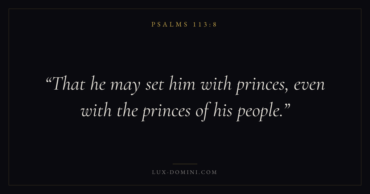 Books / Psalms / Chapter 113 / Verse 8 ← Psalms 113:7 Psalms 113:8 Psalms 113:9 → That he may set him with princes, even with the princes of his people. Download verse card Share on Twitter Share on Facebook Pin it ✦ Key themes FaithPrayerPraiseLament Read with Hebrews 11:1Romans 10:17Matthew 6:9Luke 18:1 Related topics Bible verses about faithBible verses about prayerBible verses about thankfulness and gratitudeBible verses about grief and loss ✦ Psalms Chapter 113 verses V. 1 V. 2 V. 3 V. 4 V. 5 V. 6 V. 7 V. 8 V. 9