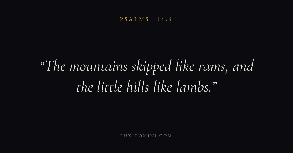 Books / Psalms / Chapter 114 / Verse 4 ← Psalms 114:3 Psalms 114:4 Psalms 114:5 → The mountains skipped like rams, and the little hills like lambs. Download verse card Share on Twitter Share on Facebook Pin it ✦ Key themes FaithPrayerPraiseLament Read with Hebrews 11:1Romans 10:17Matthew 6:9Luke 18:1 Related topics Bible verses about faithBible verses about prayerBible verses about thankfulness and gratitudeBible verses about grief and loss ✦ Psalms Chapter 114 verses V. 1 V. 2 V. 3 V. 4 V. 5 V. 6 V. 7 V. 8