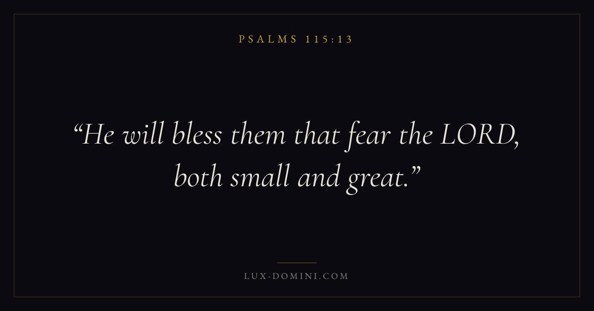 Books / Psalms / Chapter 115 / Verse 13 ← Psalms 115:12 Psalms 115:13 Psalms 115:14 → He will bless them that fear the LORD, both small and great. Download verse card Share on Twitter Share on Facebook Pin it ✦ Key themes FaithAnxiety and fearPrayerWisdomPraise Read with Hebrews 11:1Romans 10:17Philippians 4:6Isaiah 41:10 Related topics Bible verses about faithBible verses about anxiety and fearBible verses about prayerBible verses about wisdomBible verses about thankfulness and gratitude ✦ Psalms Chapter 115 verses V. 1 V. 2 V. 3 V. 4 V. 5 V. 6 V. 7 V. 8 V. 9 V. 10 V. 11 V. 12 V. 13 V. 14 V. 15 V. 16 V. 17 V. 18