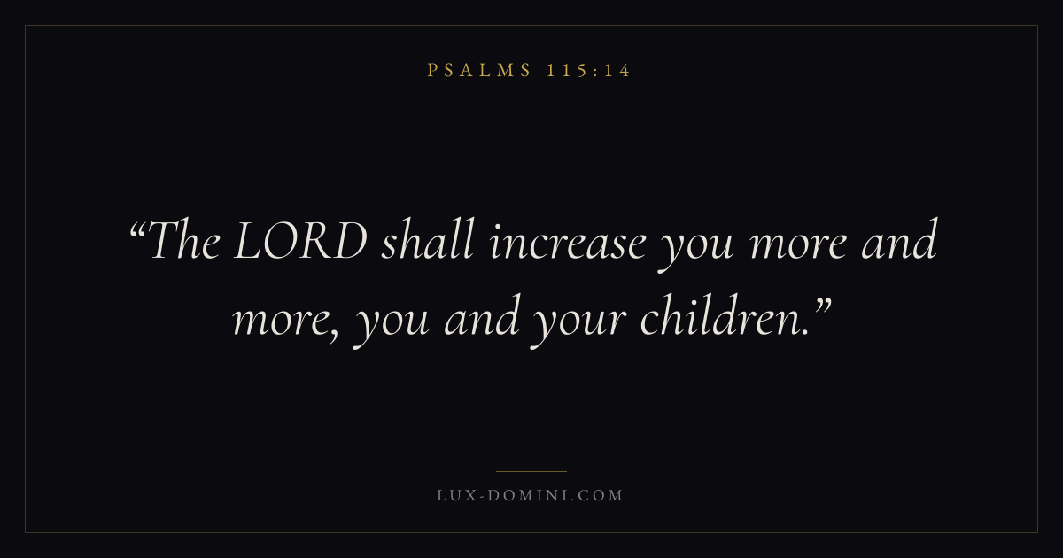 Books / Psalms / Chapter 115 / Verse 14 ← Psalms 115:13 Psalms 115:14 Psalms 115:15 → The LORD shall increase you more and more, you and your children. Download verse card Share on Twitter Share on Facebook Pin it ✦ Key themes FaithAnxiety and fearPrayerWisdomPraise Read with Hebrews 11:1Romans 10:17Philippians 4:6Isaiah 41:10 Related topics Bible verses about faithBible verses about anxiety and fearBible verses about prayerBible verses about wisdomBible verses about thankfulness and gratitude ✦ Psalms Chapter 115 verses V. 1 V. 2 V. 3 V. 4 V. 5 V. 6 V. 7 V. 8 V. 9 V. 10 V. 11 V. 12 V. 13 V. 14 V. 15 V. 16 V. 17 V. 18