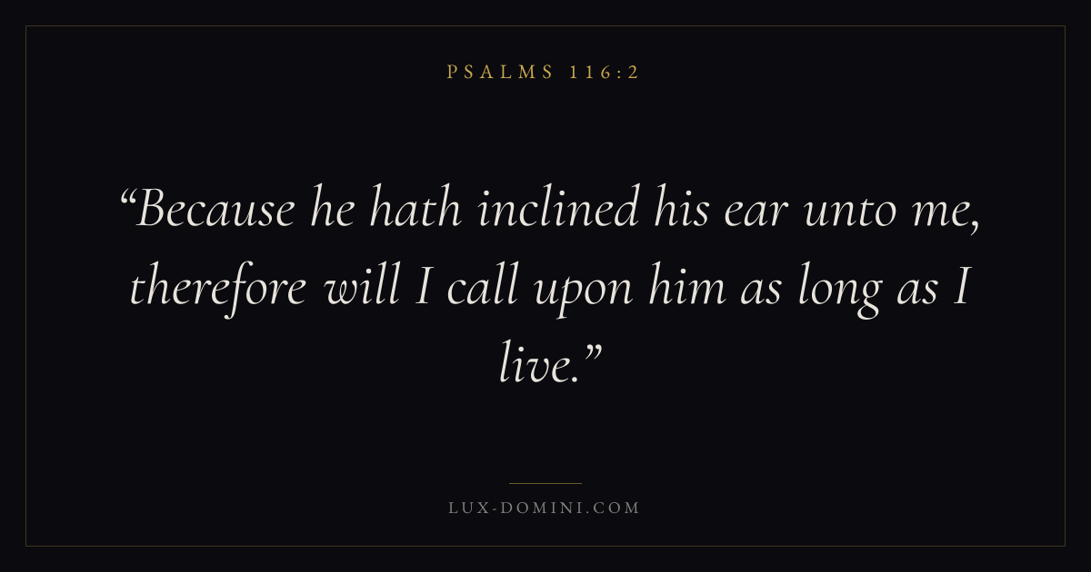 Books / Psalms / Chapter 116 / Verse 2 ← Psalms 116:1 Psalms 116:2 Psalms 116:3 → Because he hath inclined his ear unto me, therefore will I call upon him as long as I live. Download verse card Share on Twitter Share on Facebook Pin it ✦ Key themes FaithPrayerJustice and mercyPraise Read with Hebrews 11:1Romans 10:17Matthew 6:9Luke 18:1 Related topics Bible verses about faithBible verses about prayerBible verses about justice and mercyBible verses about thankfulness and gratitude ✦ Psalms Chapter 116 verses V. 1 V. 2 V. 3 V. 4 V. 5 V. 6 V. 7 V. 8 V. 9 V. 10 V. 11 V. 12 V. 13 V. 14 V. 15 V. 16 V. 17 V. 18 V. 19