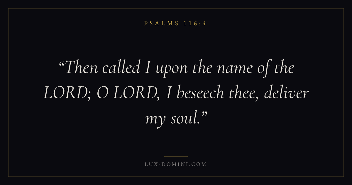 Books / Psalms / Chapter 116 / Verse 4 ← Psalms 116:3 Psalms 116:4 Psalms 116:5 → Then called I upon the name of the LORD; O LORD, I beseech thee, deliver my soul. Download verse card Share on Twitter Share on Facebook Pin it ✦ Key themes FaithPrayerJustice and mercyPraise Read with Hebrews 11:1Romans 10:17Matthew 6:9Luke 18:1 Related topics Bible verses about faithBible verses about prayerBible verses about justice and mercyBible verses about thankfulness and gratitude ✦ Psalms Chapter 116 verses V. 1 V. 2 V. 3 V. 4 V. 5 V. 6 V. 7 V. 8 V. 9 V. 10 V. 11 V. 12 V. 13 V. 14 V. 15 V. 16 V. 17 V. 18 V. 19