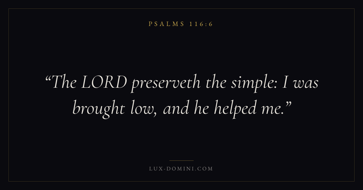 Books / Psalms / Chapter 116 / Verse 6 ← Psalms 116:5 Psalms 116:6 Psalms 116:7 → The LORD preserveth the simple: I was brought low, and he helped me. Download verse card Share on Twitter Share on Facebook Pin it ✦ Key themes FaithPrayerJustice and mercyPraise Read with Hebrews 11:1Romans 10:17Matthew 6:9Luke 18:1 Related topics Bible verses about faithBible verses about prayerBible verses about justice and mercyBible verses about thankfulness and gratitude ✦ Psalms Chapter 116 verses V. 1 V. 2 V. 3 V. 4 V. 5 V. 6 V. 7 V. 8 V. 9 V. 10 V. 11 V. 12 V. 13 V. 14 V. 15 V. 16 V. 17 V. 18 V. 19