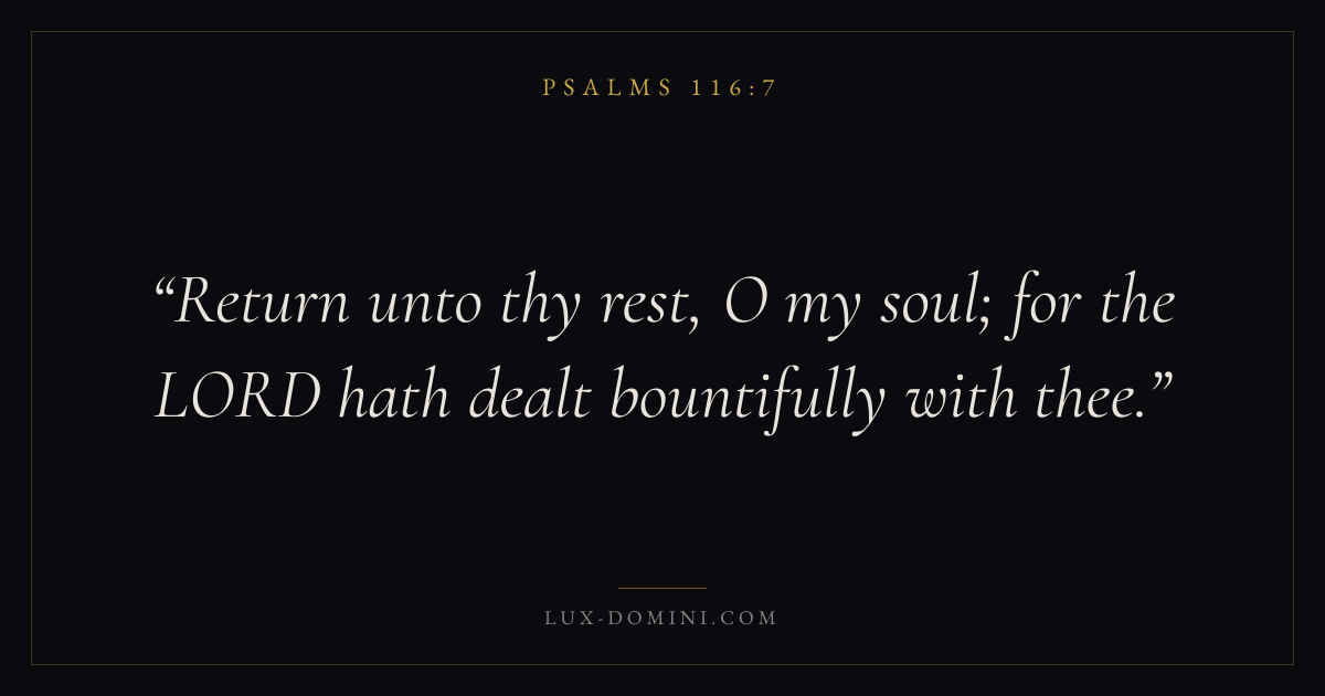 Books / Psalms / Chapter 116 / Verse 7 ← Psalms 116:6 Psalms 116:7 Psalms 116:8 → Return unto thy rest, O my soul; for the LORD hath dealt bountifully with thee. Download verse card Share on Twitter Share on Facebook Pin it ✦ Key themes FaithPrayerJustice and mercyPeacePraise Read with Hebrews 11:1Romans 10:17Matthew 6:9Luke 18:1 Related topics Bible verses about faithBible verses about prayerBible verses about justice and mercyBible verses about peaceBible verses about thankfulness and gratitude ✦ Psalms Chapter 116 verses V. 1 V. 2 V. 3 V. 4 V. 5 V. 6 V. 7 V. 8 V. 9 V. 10 V. 11 V. 12 V. 13 V. 14 V. 15 V. 16 V. 17 V. 18 V. 19