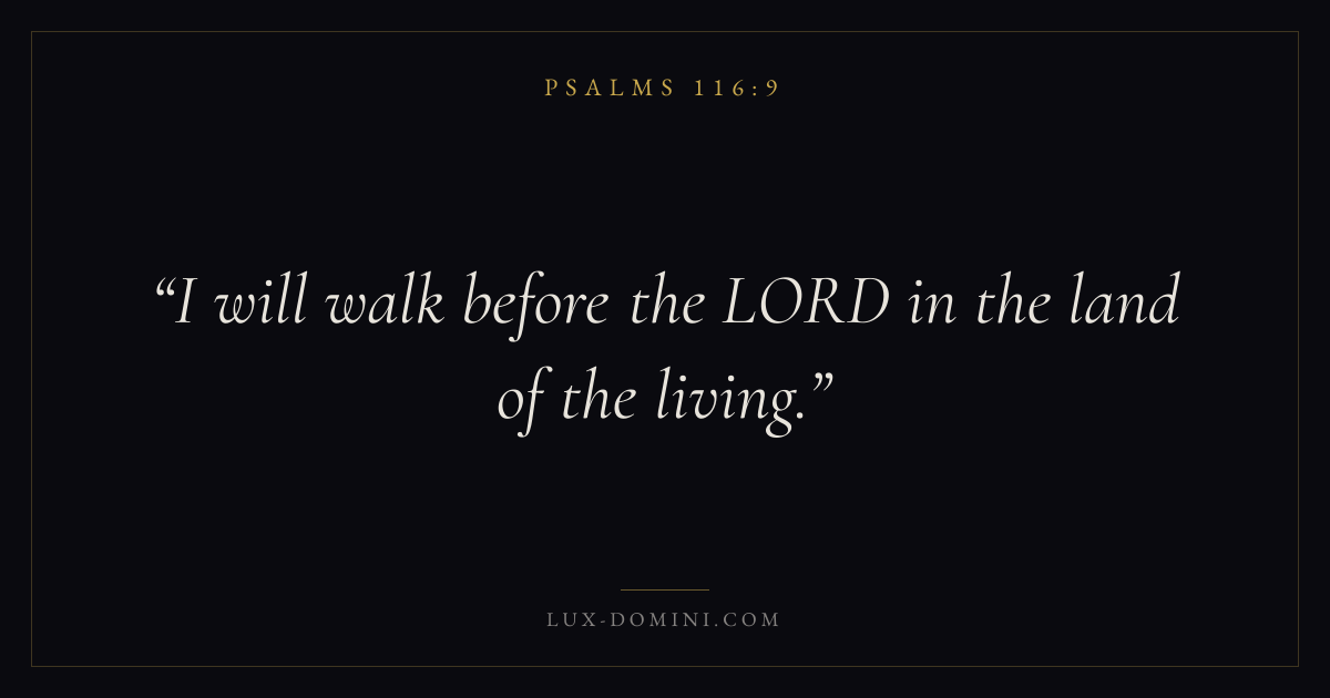 Books / Psalms / Chapter 116 / Verse 9 ← Psalms 116:8 Psalms 116:9 Psalms 116:10 → I will walk before the LORD in the land of the living. Download verse card Share on Twitter Share on Facebook Pin it ✦ Key themes FaithPrayerJustice and mercyPraise Read with Hebrews 11:1Romans 10:17Matthew 6:9Luke 18:1 Related topics Bible verses about faithBible verses about prayerBible verses about justice and mercyBible verses about thankfulness and gratitude ✦ Psalms Chapter 116 verses V. 1 V. 2 V. 3 V. 4 V. 5 V. 6 V. 7 V. 8 V. 9 V. 10 V. 11 V. 12 V. 13 V. 14 V. 15 V. 16 V. 17 V. 18 V. 19