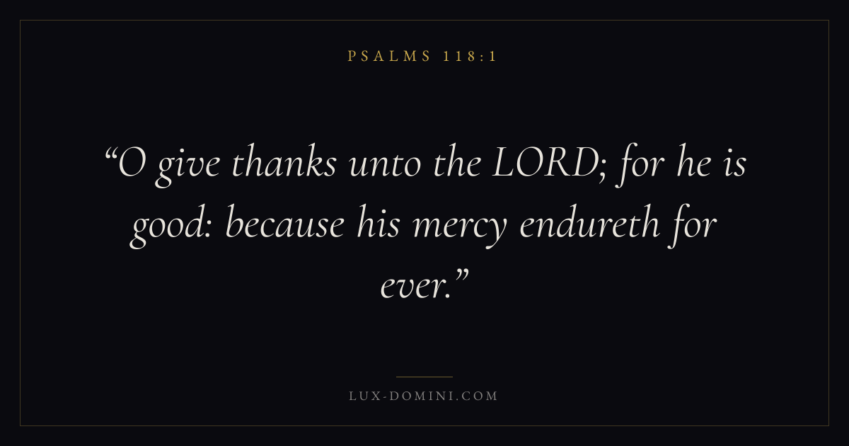 Books / Psalms / Chapter 118 / Verse 1 ← Psalms 117:2 Psalms 118:1 Psalms 118:2 → O give thanks unto the LORD; for he is good: because his mercy endureth for ever. Download verse card Share on Twitter Share on Facebook Pin it ✦ Key themes FaithSuffering and trialsPrayerJustice and mercyPraise Read with Hebrews 11:1Romans 10:17Romans 8:182 Corinthians 4:17 Related topics Bible verses about faithBible verses about suffering and trialsBible verses about prayerBible verses about justice and mercyBible verses about thankfulness and gratitude ✦ Psalms Chapter 118 verses V. 1 V. 2 V. 3 V. 4 V. 5 V. 6 V. 7 V. 8 V. 9 V. 10 V. 11 V. 12 V. 13 V. 14 V. 15 V. 16 V. 17 V. 18 V. 19 V. 20 V. 21 V. 22 V. 23 V. 24 V. 25 V. 26 V. 27 V. 28 V. 29