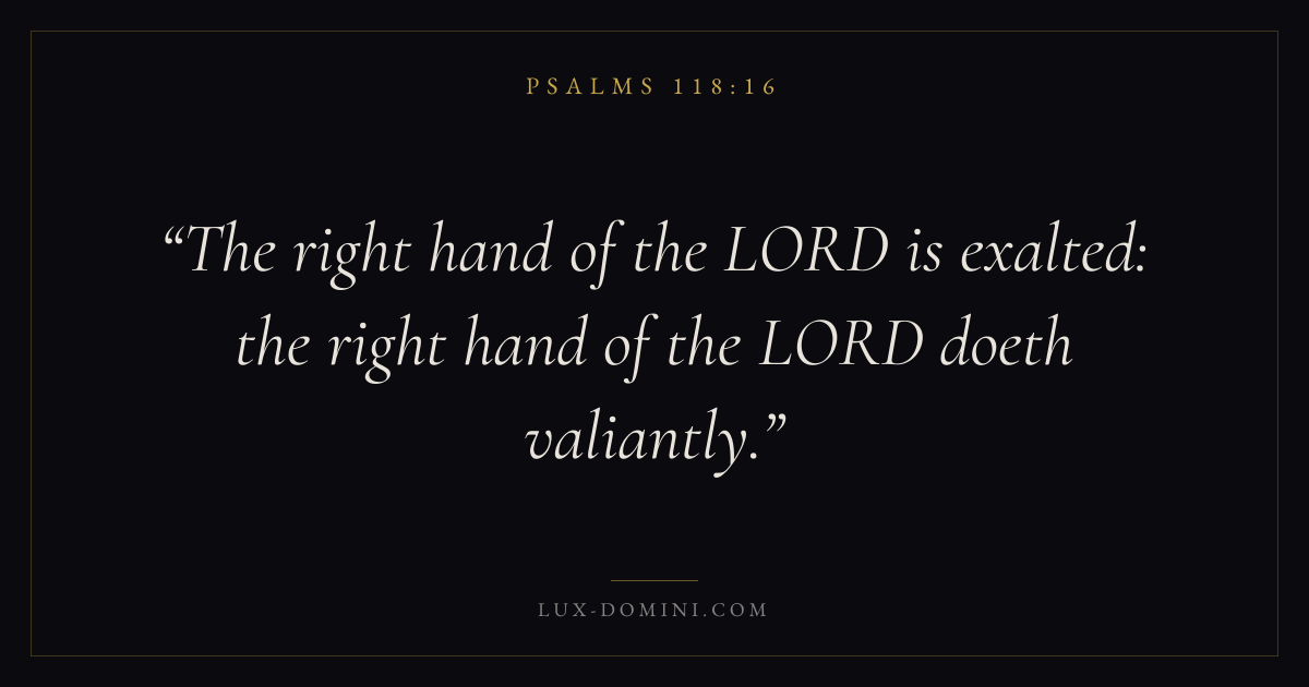 Books / Psalms / Chapter 118 / Verse 16 ← Psalms 118:15 Psalms 118:16 Psalms 118:17 → The right hand of the LORD is exalted: the right hand of the LORD doeth valiantly. Download verse card Share on Twitter Share on Facebook Pin it ✦ Key themes FaithSuffering and trialsPrayerPraise Read with Hebrews 11:1Romans 10:17Romans 8:182 Corinthians 4:17 Related topics Bible verses about faithBible verses about suffering and trialsBible verses about prayerBible verses about thankfulness and gratitude ✦ Psalms Chapter 118 verses V. 1 V. 2 V. 3 V. 4 V. 5 V. 6 V. 7 V. 8 V. 9 V. 10 V. 11 V. 12 V. 13 V. 14 V. 15 V. 16 V. 17 V. 18 V. 19 V. 20 V. 21 V. 22 V. 23 V. 24 V. 25 V. 26 V. 27 V. 28 V. 29