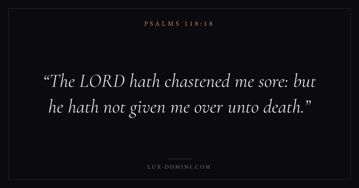 Books / Psalms / Chapter 118 / Verse 18 ← Psalms 118:17 Psalms 118:18 Psalms 118:19 → The LORD hath chastened me sore: but he hath not given me over unto death. Download verse card Share on Twitter Share on Facebook Pin it ✦ Key themes FaithSuffering and trialsPrayerPraise Read with Hebrews 11:1Romans 10:17Romans 8:182 Corinthians 4:17 Related topics Bible verses about faithBible verses about suffering and trialsBible verses about prayerBible verses about thankfulness and gratitude ✦ Psalms Chapter 118 verses V. 1 V. 2 V. 3 V. 4 V. 5 V. 6 V. 7 V. 8 V. 9 V. 10 V. 11 V. 12 V. 13 V. 14 V. 15 V. 16 V. 17 V. 18 V. 19 V. 20 V. 21 V. 22 V. 23 V. 24 V. 25 V. 26 V. 27 V. 28 V. 29
