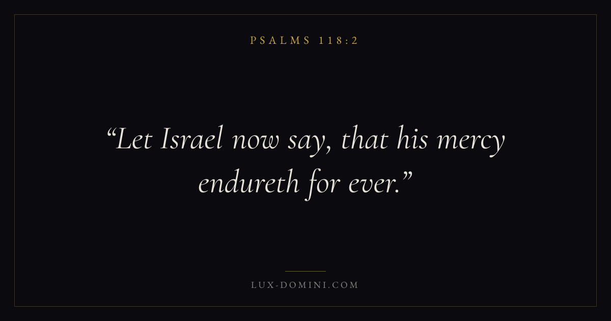 Books / Psalms / Chapter 118 / Verse 2 ← Psalms 118:1 Psalms 118:2 Psalms 118:3 → Let Israel now say, that his mercy endureth for ever. Download verse card Share on Twitter Share on Facebook Pin it ✦ Key themes FaithSuffering and trialsPrayerJustice and mercyPraise Read with Hebrews 11:1Romans 10:17Romans 8:182 Corinthians 4:17 Related topics Bible verses about faithBible verses about suffering and trialsBible verses about prayerBible verses about justice and mercyBible verses about thankfulness and gratitude ✦ Psalms Chapter 118 verses V. 1 V. 2 V. 3 V. 4 V. 5 V. 6 V. 7 V. 8 V. 9 V. 10 V. 11 V. 12 V. 13 V. 14 V. 15 V. 16 V. 17 V. 18 V. 19 V. 20 V. 21 V. 22 V. 23 V. 24 V. 25 V. 26 V. 27 V. 28 V. 29