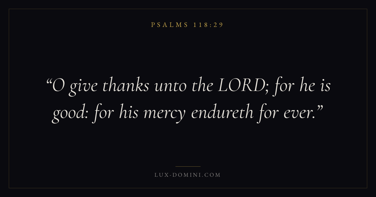 Books / Psalms / Chapter 118 / Verse 29 ← Psalms 118:28 Psalms 118:29 Psalms 119:1 → O give thanks unto the LORD; for he is good: for his mercy endureth for ever. Download verse card Share on Twitter Share on Facebook Pin it ✦ Key themes FaithPrayerJustice and mercyPraise Read with Hebrews 11:1Romans 10:17Matthew 6:9Luke 18:1 Related topics Bible verses about faithBible verses about prayerBible verses about justice and mercyBible verses about thankfulness and gratitude ✦ Psalms Chapter 118 verses V. 1 V. 2 V. 3 V. 4 V. 5 V. 6 V. 7 V. 8 V. 9 V. 10 V. 11 V. 12 V. 13 V. 14 V. 15 V. 16 V. 17 V. 18 V. 19 V. 20 V. 21 V. 22 V. 23 V. 24 V. 25 V. 26 V. 27 V. 28 V. 29