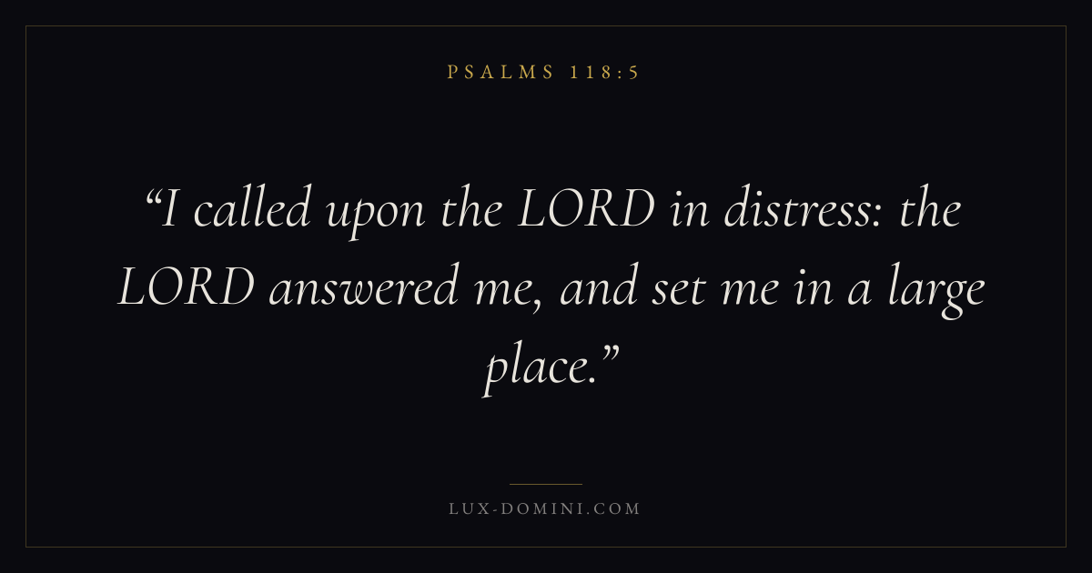 Books / Psalms / Chapter 118 / Verse 5 ← Psalms 118:4 Psalms 118:5 Psalms 118:6 → I called upon the LORD in distress: the LORD answered me, and set me in a large place. Download verse card Share on Twitter Share on Facebook Pin it ✦ Key themes FaithSuffering and trialsPrayerPraise Read with Hebrews 11:1Romans 10:17Romans 8:182 Corinthians 4:17 Related topics Bible verses about faithBible verses about suffering and trialsBible verses about prayerBible verses about thankfulness and gratitude ✦ Psalms Chapter 118 verses V. 1 V. 2 V. 3 V. 4 V. 5 V. 6 V. 7 V. 8 V. 9 V. 10 V. 11 V. 12 V. 13 V. 14 V. 15 V. 16 V. 17 V. 18 V. 19 V. 20 V. 21 V. 22 V. 23 V. 24 V. 25 V. 26 V. 27 V. 28 V. 29