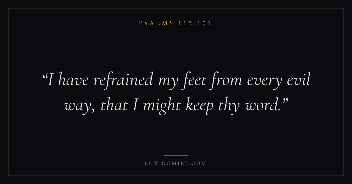 Books / Psalms / Chapter 119 / Verse 101 ← Psalms 119:100 Psalms 119:101 Psalms 119:102 → I have refrained my feet from every evil way, that I might keep thy word. Download verse card Share on Twitter Share on Facebook Pin it ✦ Key themes LoveFaithPrayerWisdomPraise Read with John 3:161 Corinthians 13:4Hebrews 11:1Romans 10:17 Related topics Bible verses about loveBible verses about faithBible verses about prayerBible verses about wisdomBible verses about thankfulness and gratitude ✦ Psalms Chapter 119 verses V. 1 V. 2 V. 3 V. 4 V. 5 V. 6 V. 7 V. 8 V. 9 V. 10 V. 11 V. 12 V. 13 V. 14 V. 15 V. 16 V. 17 V. 18 V. 19 V. 20 V. 21 V. 22 V. 23 V. 24 V. 25 V. 26 V. 27 V. 28 V. 29 V. 30 V. 31 V. 32 V. 33 V. 34 V. 35 V. 36 V. 37 V. 38 V. 39 V. 40 V. 41 V. 42 V. 43 V. 44 V. 45 V. 46 V. 47 V. 48 V. 49 V. 50 V. 51 V. 52 V. 53 V. 54 V. 55 V. 56 V. 57 V. 58 V. 59 V. 60 V. 61 V. 62 V. 63 V. 64 V. 65 V. 66 V. 67 V. 68 V. 69 V. 70 V. 71 V. 72 V. 73 V. 74 V. 75 V. 76 V. 77 V. 78 V. 79 V. 80 V. 81 V. 82 V. 83 V. 84 V. 85 V. 86 V. 87 V. 88 V. 89 V. 90 V. 91 V. 92 V. 93 V. 94 V. 95 V. 96 V. 97 V. 98 V. 99 V. 100 V. 101 V. 102 V. 103 V. 104 V. 105 V. 106 V. 107 V. 108 V. 109 V. 110 V. 111 V. 112 V. 113 V. 114 V. 115 V. 116 V. 117 V. 118 V. 119 V. 120 V. 121 V. 122 V. 123 V. 124 V. 125 V. 126 V. 127 V. 128 V. 129 V. 130 V. 131 V. 132 V. 133 V. 134 V. 135 V. 136 V. 137 V. 138 V. 139 V. 140 V. 141 V. 142 V. 143 V. 144 V. 145 V. 146 V. 147 V. 148 V. 149 V. 150 V. 151 V. 152 V. 153 V. 154 V. 155 V. 156 V. 157 V. 158 V. 159 V. 160 V. 161 V. 162 V. 163 V. 164 V. 165 V. 166 V. 167 V. 168 V. 169 V. 170 V. 171 V. 172 V. 173 V. 174 V. 175 V. 176
