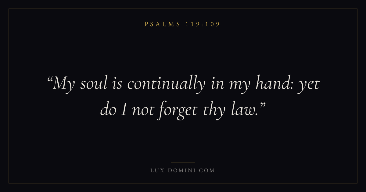 Books / Psalms / Chapter 119 / Verse 109 ← Psalms 119:108 Psalms 119:109 Psalms 119:110 → My soul is continually in my hand: yet do I not forget thy law. Download verse card Share on Twitter Share on Facebook Pin it ✦ Key themes FaithPrayerTruthPraise Read with Hebrews 11:1Romans 10:17Matthew 6:9Luke 18:1 Related topics Bible verses about faithBible verses about prayerBible verses about truthBible verses about thankfulness and gratitude ✦ Psalms Chapter 119 verses V. 1 V. 2 V. 3 V. 4 V. 5 V. 6 V. 7 V. 8 V. 9 V. 10 V. 11 V. 12 V. 13 V. 14 V. 15 V. 16 V. 17 V. 18 V. 19 V. 20 V. 21 V. 22 V. 23 V. 24 V. 25 V. 26 V. 27 V. 28 V. 29 V. 30 V. 31 V. 32 V. 33 V. 34 V. 35 V. 36 V. 37 V. 38 V. 39 V. 40 V. 41 V. 42 V. 43 V. 44 V. 45 V. 46 V. 47 V. 48 V. 49 V. 50 V. 51 V. 52 V. 53 V. 54 V. 55 V. 56 V. 57 V. 58 V. 59 V. 60 V. 61 V. 62 V. 63 V. 64 V. 65 V. 66 V. 67 V. 68 V. 69 V. 70 V. 71 V. 72 V. 73 V. 74 V. 75 V. 76 V. 77 V. 78 V. 79 V. 80 V. 81 V. 82 V. 83 V. 84 V. 85 V. 86 V. 87 V. 88 V. 89 V. 90 V. 91 V. 92 V. 93 V. 94 V. 95 V. 96 V. 97 V. 98 V. 99 V. 100 V. 101 V. 102 V. 103 V. 104 V. 105 V. 106 V. 107 V. 108 V. 109 V. 110 V. 111 V. 112 V. 113 V. 114 V. 115 V. 116 V. 117 V. 118 V. 119 V. 120 V. 121 V. 122 V. 123 V. 124 V. 125 V. 126 V. 127 V. 128 V. 129 V. 130 V. 131 V. 132 V. 133 V. 134 V. 135 V. 136 V. 137 V. 138 V. 139 V. 140 V. 141 V. 142 V. 143 V. 144 V. 145 V. 146 V. 147 V. 148 V. 149 V. 150 V. 151 V. 152 V. 153 V. 154 V. 155 V. 156 V. 157 V. 158 V. 159 V. 160 V. 161 V. 162 V. 163 V. 164 V. 165 V. 166 V. 167 V. 168 V. 169 V. 170 V. 171 V. 172 V. 173 V. 174 V. 175 V. 176
