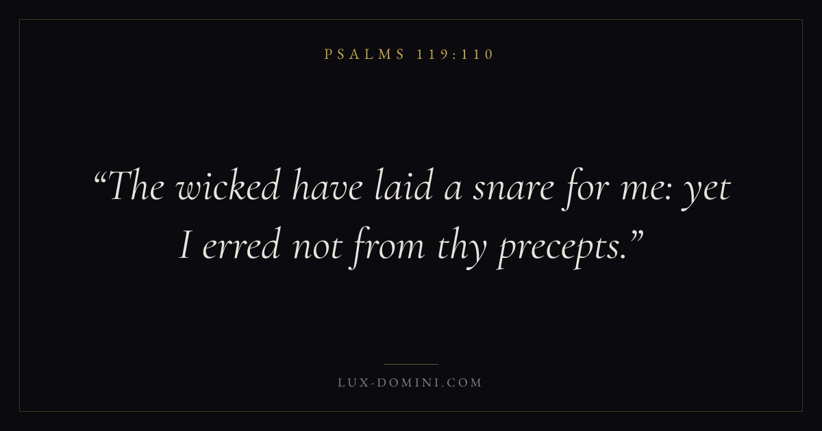 Books / Psalms / Chapter 119 / Verse 110 ← Psalms 119:109 Psalms 119:110 Psalms 119:111 → The wicked have laid a snare for me: yet I erred not from thy precepts. Download verse card Share on Twitter Share on Facebook Pin it ✦ Key themes FaithPrayerTruthPraise Read with Hebrews 11:1Romans 10:17Matthew 6:9Luke 18:1 Related topics Bible verses about faithBible verses about prayerBible verses about truthBible verses about thankfulness and gratitude ✦ Psalms Chapter 119 verses V. 1 V. 2 V. 3 V. 4 V. 5 V. 6 V. 7 V. 8 V. 9 V. 10 V. 11 V. 12 V. 13 V. 14 V. 15 V. 16 V. 17 V. 18 V. 19 V. 20 V. 21 V. 22 V. 23 V. 24 V. 25 V. 26 V. 27 V. 28 V. 29 V. 30 V. 31 V. 32 V. 33 V. 34 V. 35 V. 36 V. 37 V. 38 V. 39 V. 40 V. 41 V. 42 V. 43 V. 44 V. 45 V. 46 V. 47 V. 48 V. 49 V. 50 V. 51 V. 52 V. 53 V. 54 V. 55 V. 56 V. 57 V. 58 V. 59 V. 60 V. 61 V. 62 V. 63 V. 64 V. 65 V. 66 V. 67 V. 68 V. 69 V. 70 V. 71 V. 72 V. 73 V. 74 V. 75 V. 76 V. 77 V. 78 V. 79 V. 80 V. 81 V. 82 V. 83 V. 84 V. 85 V. 86 V. 87 V. 88 V. 89 V. 90 V. 91 V. 92 V. 93 V. 94 V. 95 V. 96 V. 97 V. 98 V. 99 V. 100 V. 101 V. 102 V. 103 V. 104 V. 105 V. 106 V. 107 V. 108 V. 109 V. 110 V. 111 V. 112 V. 113 V. 114 V. 115 V. 116 V. 117 V. 118 V. 119 V. 120 V. 121 V. 122 V. 123 V. 124 V. 125 V. 126 V. 127 V. 128 V. 129 V. 130 V. 131 V. 132 V. 133 V. 134 V. 135 V. 136 V. 137 V. 138 V. 139 V. 140 V. 141 V. 142 V. 143 V. 144 V. 145 V. 146 V. 147 V. 148 V. 149 V. 150 V. 151 V. 152 V. 153 V. 154 V. 155 V. 156 V. 157 V. 158 V. 159 V. 160 V. 161 V. 162 V. 163 V. 164 V. 165 V. 166 V. 167 V. 168 V. 169 V. 170 V. 171 V. 172 V. 173 V. 174 V. 175 V. 176