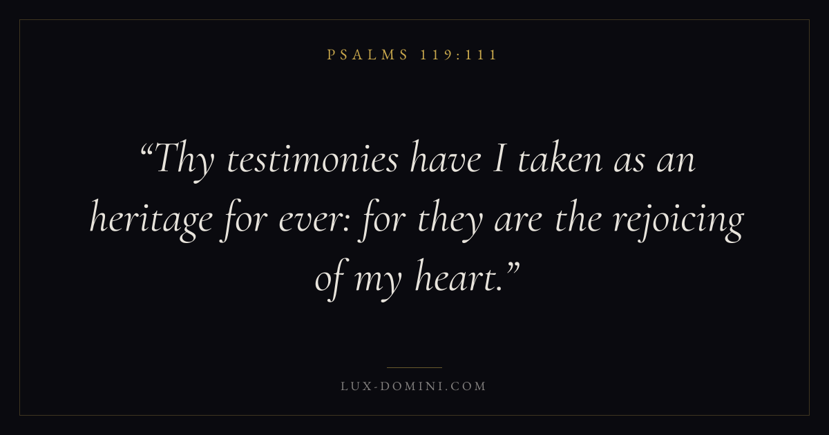 Books / Psalms / Chapter 119 / Verse 111 ← Psalms 119:110 Psalms 119:111 Psalms 119:112 → Thy testimonies have I taken as an heritage for ever: for they are the rejoicing of my heart. Download verse card Share on Twitter Share on Facebook Pin it ✦ Key themes FaithPrayerTruthPraise Read with Hebrews 11:1Romans 10:17Matthew 6:9Luke 18:1 Related topics Bible verses about faithBible verses about prayerBible verses about truthBible verses about thankfulness and gratitude ✦ Psalms Chapter 119 verses V. 1 V. 2 V. 3 V. 4 V. 5 V. 6 V. 7 V. 8 V. 9 V. 10 V. 11 V. 12 V. 13 V. 14 V. 15 V. 16 V. 17 V. 18 V. 19 V. 20 V. 21 V. 22 V. 23 V. 24 V. 25 V. 26 V. 27 V. 28 V. 29 V. 30 V. 31 V. 32 V. 33 V. 34 V. 35 V. 36 V. 37 V. 38 V. 39 V. 40 V. 41 V. 42 V. 43 V. 44 V. 45 V. 46 V. 47 V. 48 V. 49 V. 50 V. 51 V. 52 V. 53 V. 54 V. 55 V. 56 V. 57 V. 58 V. 59 V. 60 V. 61 V. 62 V. 63 V. 64 V. 65 V. 66 V. 67 V. 68 V. 69 V. 70 V. 71 V. 72 V. 73 V. 74 V. 75 V. 76 V. 77 V. 78 V. 79 V. 80 V. 81 V. 82 V. 83 V. 84 V. 85 V. 86 V. 87 V. 88 V. 89 V. 90 V. 91 V. 92 V. 93 V. 94 V. 95 V. 96 V. 97 V. 98 V. 99 V. 100 V. 101 V. 102 V. 103 V. 104 V. 105 V. 106 V. 107 V. 108 V. 109 V. 110 V. 111 V. 112 V. 113 V. 114 V. 115 V. 116 V. 117 V. 118 V. 119 V. 120 V. 121 V. 122 V. 123 V. 124 V. 125 V. 126 V. 127 V. 128 V. 129 V. 130 V. 131 V. 132 V. 133 V. 134 V. 135 V. 136 V. 137 V. 138 V. 139 V. 140 V. 141 V. 142 V. 143 V. 144 V. 145 V. 146 V. 147 V. 148 V. 149 V. 150 V. 151 V. 152 V. 153 V. 154 V. 155 V. 156 V. 157 V. 158 V. 159 V. 160 V. 161 V. 162 V. 163 V. 164 V. 165 V. 166 V. 167 V. 168 V. 169 V. 170 V. 171 V. 172 V. 173 V. 174 V. 175 V. 176