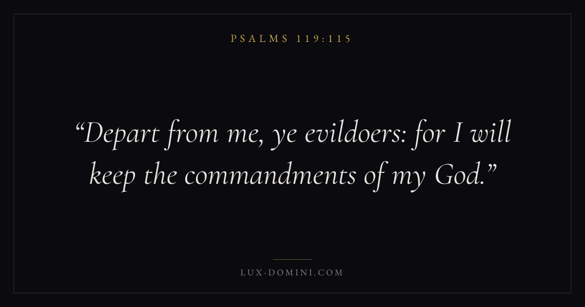 Books / Psalms / Chapter 119 / Verse 115 ← Psalms 119:114 Psalms 119:115 Psalms 119:116 → Depart from me, ye evildoers: for I will keep the commandments of my God. Download verse card Share on Twitter Share on Facebook Pin it ✦ Key themes LoveFaithPrayerPraise Read with John 3:161 Corinthians 13:4Hebrews 11:1Romans 10:17 Related topics Bible verses about loveBible verses about faithBible verses about prayerBible verses about thankfulness and gratitude ✦ Psalms Chapter 119 verses V. 1 V. 2 V. 3 V. 4 V. 5 V. 6 V. 7 V. 8 V. 9 V. 10 V. 11 V. 12 V. 13 V. 14 V. 15 V. 16 V. 17 V. 18 V. 19 V. 20 V. 21 V. 22 V. 23 V. 24 V. 25 V. 26 V. 27 V. 28 V. 29 V. 30 V. 31 V. 32 V. 33 V. 34 V. 35 V. 36 V. 37 V. 38 V. 39 V. 40 V. 41 V. 42 V. 43 V. 44 V. 45 V. 46 V. 47 V. 48 V. 49 V. 50 V. 51 V. 52 V. 53 V. 54 V. 55 V. 56 V. 57 V. 58 V. 59 V. 60 V. 61 V. 62 V. 63 V. 64 V. 65 V. 66 V. 67 V. 68 V. 69 V. 70 V. 71 V. 72 V. 73 V. 74 V. 75 V. 76 V. 77 V. 78 V. 79 V. 80 V. 81 V. 82 V. 83 V. 84 V. 85 V. 86 V. 87 V. 88 V. 89 V. 90 V. 91 V. 92 V. 93 V. 94 V. 95 V. 96 V. 97 V. 98 V. 99 V. 100 V. 101 V. 102 V. 103 V. 104 V. 105 V. 106 V. 107 V. 108 V. 109 V. 110 V. 111 V. 112 V. 113 V. 114 V. 115 V. 116 V. 117 V. 118 V. 119 V. 120 V. 121 V. 122 V. 123 V. 124 V. 125 V. 126 V. 127 V. 128 V. 129 V. 130 V. 131 V. 132 V. 133 V. 134 V. 135 V. 136 V. 137 V. 138 V. 139 V. 140 V. 141 V. 142 V. 143 V. 144 V. 145 V. 146 V. 147 V. 148 V. 149 V. 150 V. 151 V. 152 V. 153 V. 154 V. 155 V. 156 V. 157 V. 158 V. 159 V. 160 V. 161 V. 162 V. 163 V. 164 V. 165 V. 166 V. 167 V. 168 V. 169 V. 170 V. 171 V. 172 V. 173 V. 174 V. 175 V. 176