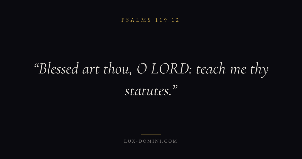 Books / Psalms / Chapter 119 / Verse 12 ← Psalms 119:11 Psalms 119:12 Psalms 119:13 → Blessed art thou, O LORD: teach me thy statutes. Download verse card Share on Twitter Share on Facebook Pin it ✦ Key themes FaithPrayerPraiseLament Read with Hebrews 11:1Romans 10:17Matthew 6:9Luke 18:1 Related topics Bible verses about faithBible verses about prayerBible verses about thankfulness and gratitudeBible verses about grief and loss ✦ Psalms Chapter 119 verses V. 1 V. 2 V. 3 V. 4 V. 5 V. 6 V. 7 V. 8 V. 9 V. 10 V. 11 V. 12 V. 13 V. 14 V. 15 V. 16 V. 17 V. 18 V. 19 V. 20 V. 21 V. 22 V. 23 V. 24 V. 25 V. 26 V. 27 V. 28 V. 29 V. 30 V. 31 V. 32 V. 33 V. 34 V. 35 V. 36 V. 37 V. 38 V. 39 V. 40 V. 41 V. 42 V. 43 V. 44 V. 45 V. 46 V. 47 V. 48 V. 49 V. 50 V. 51 V. 52 V. 53 V. 54 V. 55 V. 56 V. 57 V. 58 V. 59 V. 60 V. 61 V. 62 V. 63 V. 64 V. 65 V. 66 V. 67 V. 68 V. 69 V. 70 V. 71 V. 72 V. 73 V. 74 V. 75 V. 76 V. 77 V. 78 V. 79 V. 80 V. 81 V. 82 V. 83 V. 84 V. 85 V. 86 V. 87 V. 88 V. 89 V. 90 V. 91 V. 92 V. 93 V. 94 V. 95 V. 96 V. 97 V. 98 V. 99 V. 100 V. 101 V. 102 V. 103 V. 104 V. 105 V. 106 V. 107 V. 108 V. 109 V. 110 V. 111 V. 112 V. 113 V. 114 V. 115 V. 116 V. 117 V. 118 V. 119 V. 120 V. 121 V. 122 V. 123 V. 124 V. 125 V. 126 V. 127 V. 128 V. 129 V. 130 V. 131 V. 132 V. 133 V. 134 V. 135 V. 136 V. 137 V. 138 V. 139 V. 140 V. 141 V. 142 V. 143 V. 144 V. 145 V. 146 V. 147 V. 148 V. 149 V. 150 V. 151 V. 152 V. 153 V. 154 V. 155 V. 156 V. 157 V. 158 V. 159 V. 160 V. 161 V. 162 V. 163 V. 164 V. 165 V. 166 V. 167 V. 168 V. 169 V. 170 V. 171 V. 172 V. 173 V. 174 V. 175 V. 176