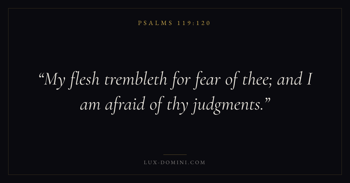 Books / Psalms / Chapter 119 / Verse 120 ← Psalms 119:119 Psalms 119:120 Psalms 119:121 → My flesh trembleth for fear of thee; and I am afraid of thy judgments. Download verse card Share on Twitter Share on Facebook Pin it ✦ Key themes LoveFaithAnxiety and fearPrayerPraise Read with John 3:161 Corinthians 13:4Hebrews 11:1Romans 10:17 Related topics Bible verses about loveBible verses about faithBible verses about anxiety and fearBible verses about prayerBible verses about thankfulness and gratitude ✦ Psalms Chapter 119 verses V. 1 V. 2 V. 3 V. 4 V. 5 V. 6 V. 7 V. 8 V. 9 V. 10 V. 11 V. 12 V. 13 V. 14 V. 15 V. 16 V. 17 V. 18 V. 19 V. 20 V. 21 V. 22 V. 23 V. 24 V. 25 V. 26 V. 27 V. 28 V. 29 V. 30 V. 31 V. 32 V. 33 V. 34 V. 35 V. 36 V. 37 V. 38 V. 39 V. 40 V. 41 V. 42 V. 43 V. 44 V. 45 V. 46 V. 47 V. 48 V. 49 V. 50 V. 51 V. 52 V. 53 V. 54 V. 55 V. 56 V. 57 V. 58 V. 59 V. 60 V. 61 V. 62 V. 63 V. 64 V. 65 V. 66 V. 67 V. 68 V. 69 V. 70 V. 71 V. 72 V. 73 V. 74 V. 75 V. 76 V. 77 V. 78 V. 79 V. 80 V. 81 V. 82 V. 83 V. 84 V. 85 V. 86 V. 87 V. 88 V. 89 V. 90 V. 91 V. 92 V. 93 V. 94 V. 95 V. 96 V. 97 V. 98 V. 99 V. 100 V. 101 V. 102 V. 103 V. 104 V. 105 V. 106 V. 107 V. 108 V. 109 V. 110 V. 111 V. 112 V. 113 V. 114 V. 115 V. 116 V. 117 V. 118 V. 119 V. 120 V. 121 V. 122 V. 123 V. 124 V. 125 V. 126 V. 127 V. 128 V. 129 V. 130 V. 131 V. 132 V. 133 V. 134 V. 135 V. 136 V. 137 V. 138 V. 139 V. 140 V. 141 V. 142 V. 143 V. 144 V. 145 V. 146 V. 147 V. 148 V. 149 V. 150 V. 151 V. 152 V. 153 V. 154 V. 155 V. 156 V. 157 V. 158 V. 159 V. 160 V. 161 V. 162 V. 163 V. 164 V. 165 V. 166 V. 167 V. 168 V. 169 V. 170 V. 171 V. 172 V. 173 V. 174 V. 175 V. 176