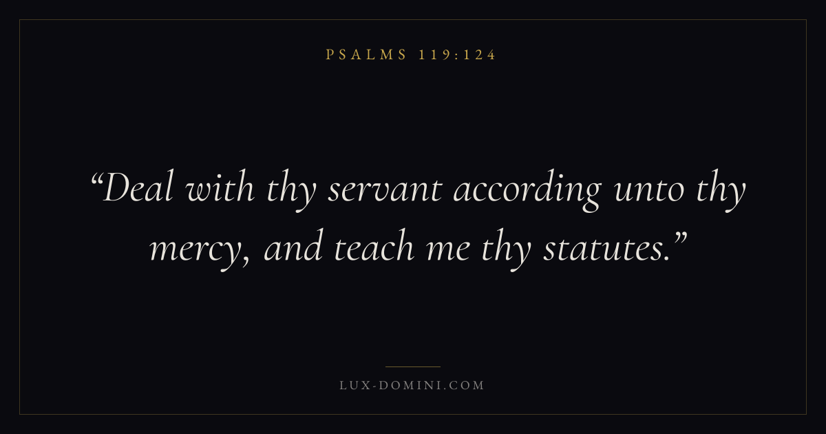Books / Psalms / Chapter 119 / Verse 124 ← Psalms 119:123 Psalms 119:124 Psalms 119:125 → Deal with thy servant according unto thy mercy, and teach me thy statutes. Download verse card Share on Twitter Share on Facebook Pin it ✦ Key themes FaithPrayerJustice and mercySalvationPraise Read with Hebrews 11:1Romans 10:17Matthew 6:9Luke 18:1 Related topics Bible verses about faithBible verses about prayerBible verses about justice and mercyBible verses about salvationBible verses about thankfulness and gratitude ✦ Psalms Chapter 119 verses V. 1 V. 2 V. 3 V. 4 V. 5 V. 6 V. 7 V. 8 V. 9 V. 10 V. 11 V. 12 V. 13 V. 14 V. 15 V. 16 V. 17 V. 18 V. 19 V. 20 V. 21 V. 22 V. 23 V. 24 V. 25 V. 26 V. 27 V. 28 V. 29 V. 30 V. 31 V. 32 V. 33 V. 34 V. 35 V. 36 V. 37 V. 38 V. 39 V. 40 V. 41 V. 42 V. 43 V. 44 V. 45 V. 46 V. 47 V. 48 V. 49 V. 50 V. 51 V. 52 V. 53 V. 54 V. 55 V. 56 V. 57 V. 58 V. 59 V. 60 V. 61 V. 62 V. 63 V. 64 V. 65 V. 66 V. 67 V. 68 V. 69 V. 70 V. 71 V. 72 V. 73 V. 74 V. 75 V. 76 V. 77 V. 78 V. 79 V. 80 V. 81 V. 82 V. 83 V. 84 V. 85 V. 86 V. 87 V. 88 V. 89 V. 90 V. 91 V. 92 V. 93 V. 94 V. 95 V. 96 V. 97 V. 98 V. 99 V. 100 V. 101 V. 102 V. 103 V. 104 V. 105 V. 106 V. 107 V. 108 V. 109 V. 110 V. 111 V. 112 V. 113 V. 114 V. 115 V. 116 V. 117 V. 118 V. 119 V. 120 V. 121 V. 122 V. 123 V. 124 V. 125 V. 126 V. 127 V. 128 V. 129 V. 130 V. 131 V. 132 V. 133 V. 134 V. 135 V. 136 V. 137 V. 138 V. 139 V. 140 V. 141 V. 142 V. 143 V. 144 V. 145 V. 146 V. 147 V. 148 V. 149 V. 150 V. 151 V. 152 V. 153 V. 154 V. 155 V. 156 V. 157 V. 158 V. 159 V. 160 V. 161 V. 162 V. 163 V. 164 V. 165 V. 166 V. 167 V. 168 V. 169 V. 170 V. 171 V. 172 V. 173 V. 174 V. 175 V. 176