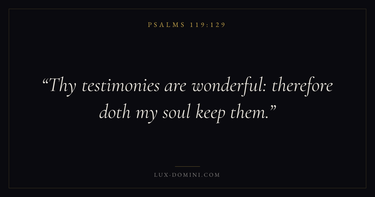 Books / Psalms / Chapter 119 / Verse 129 ← Psalms 119:128 Psalms 119:129 Psalms 119:130 → Thy testimonies are wonderful: therefore doth my soul keep them. Download verse card Share on Twitter Share on Facebook Pin it ✦ Key themes LoveFaithPrayerPraise Read with John 3:161 Corinthians 13:4Hebrews 11:1Romans 10:17 Related topics Bible verses about loveBible verses about faithBible verses about prayerBible verses about thankfulness and gratitude ✦ Psalms Chapter 119 verses V. 1 V. 2 V. 3 V. 4 V. 5 V. 6 V. 7 V. 8 V. 9 V. 10 V. 11 V. 12 V. 13 V. 14 V. 15 V. 16 V. 17 V. 18 V. 19 V. 20 V. 21 V. 22 V. 23 V. 24 V. 25 V. 26 V. 27 V. 28 V. 29 V. 30 V. 31 V. 32 V. 33 V. 34 V. 35 V. 36 V. 37 V. 38 V. 39 V. 40 V. 41 V. 42 V. 43 V. 44 V. 45 V. 46 V. 47 V. 48 V. 49 V. 50 V. 51 V. 52 V. 53 V. 54 V. 55 V. 56 V. 57 V. 58 V. 59 V. 60 V. 61 V. 62 V. 63 V. 64 V. 65 V. 66 V. 67 V. 68 V. 69 V. 70 V. 71 V. 72 V. 73 V. 74 V. 75 V. 76 V. 77 V. 78 V. 79 V. 80 V. 81 V. 82 V. 83 V. 84 V. 85 V. 86 V. 87 V. 88 V. 89 V. 90 V. 91 V. 92 V. 93 V. 94 V. 95 V. 96 V. 97 V. 98 V. 99 V. 100 V. 101 V. 102 V. 103 V. 104 V. 105 V. 106 V. 107 V. 108 V. 109 V. 110 V. 111 V. 112 V. 113 V. 114 V. 115 V. 116 V. 117 V. 118 V. 119 V. 120 V. 121 V. 122 V. 123 V. 124 V. 125 V. 126 V. 127 V. 128 V. 129 V. 130 V. 131 V. 132 V. 133 V. 134 V. 135 V. 136 V. 137 V. 138 V. 139 V. 140 V. 141 V. 142 V. 143 V. 144 V. 145 V. 146 V. 147 V. 148 V. 149 V. 150 V. 151 V. 152 V. 153 V. 154 V. 155 V. 156 V. 157 V. 158 V. 159 V. 160 V. 161 V. 162 V. 163 V. 164 V. 165 V. 166 V. 167 V. 168 V. 169 V. 170 V. 171 V. 172 V. 173 V. 174 V. 175 V. 176