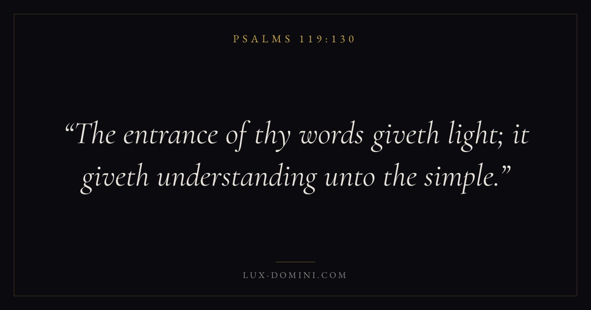 Books / Psalms / Chapter 119 / Verse 130 ← Psalms 119:129 Psalms 119:130 Psalms 119:131 → The entrance of thy words giveth light; it giveth understanding unto the simple. Download verse card Share on Twitter Share on Facebook Pin it ✦ Key themes LoveFaithPrayerWisdomPraise Read with John 3:161 Corinthians 13:4Hebrews 11:1Romans 10:17 Related topics Bible verses about loveBible verses about faithBible verses about prayerBible verses about wisdomBible verses about thankfulness and gratitude ✦ Psalms Chapter 119 verses V. 1 V. 2 V. 3 V. 4 V. 5 V. 6 V. 7 V. 8 V. 9 V. 10 V. 11 V. 12 V. 13 V. 14 V. 15 V. 16 V. 17 V. 18 V. 19 V. 20 V. 21 V. 22 V. 23 V. 24 V. 25 V. 26 V. 27 V. 28 V. 29 V. 30 V. 31 V. 32 V. 33 V. 34 V. 35 V. 36 V. 37 V. 38 V. 39 V. 40 V. 41 V. 42 V. 43 V. 44 V. 45 V. 46 V. 47 V. 48 V. 49 V. 50 V. 51 V. 52 V. 53 V. 54 V. 55 V. 56 V. 57 V. 58 V. 59 V. 60 V. 61 V. 62 V. 63 V. 64 V. 65 V. 66 V. 67 V. 68 V. 69 V. 70 V. 71 V. 72 V. 73 V. 74 V. 75 V. 76 V. 77 V. 78 V. 79 V. 80 V. 81 V. 82 V. 83 V. 84 V. 85 V. 86 V. 87 V. 88 V. 89 V. 90 V. 91 V. 92 V. 93 V. 94 V. 95 V. 96 V. 97 V. 98 V. 99 V. 100 V. 101 V. 102 V. 103 V. 104 V. 105 V. 106 V. 107 V. 108 V. 109 V. 110 V. 111 V. 112 V. 113 V. 114 V. 115 V. 116 V. 117 V. 118 V. 119 V. 120 V. 121 V. 122 V. 123 V. 124 V. 125 V. 126 V. 127 V. 128 V. 129 V. 130 V. 131 V. 132 V. 133 V. 134 V. 135 V. 136 V. 137 V. 138 V. 139 V. 140 V. 141 V. 142 V. 143 V. 144 V. 145 V. 146 V. 147 V. 148 V. 149 V. 150 V. 151 V. 152 V. 153 V. 154 V. 155 V. 156 V. 157 V. 158 V. 159 V. 160 V. 161 V. 162 V. 163 V. 164 V. 165 V. 166 V. 167 V. 168 V. 169 V. 170 V. 171 V. 172 V. 173 V. 174 V. 175 V. 176