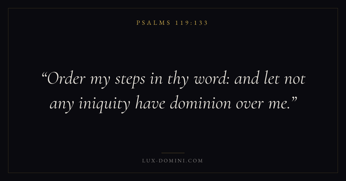 Books / Psalms / Chapter 119 / Verse 133 ← Psalms 119:132 Psalms 119:133 Psalms 119:134 → Order my steps in thy word: and let not any iniquity have dominion over me. Download verse card Share on Twitter Share on Facebook Pin it ✦ Key themes LoveFaithPrayerTruthPraise Read with John 3:161 Corinthians 13:4Hebrews 11:1Romans 10:17 Related topics Bible verses about loveBible verses about faithBible verses about prayerBible verses about truthBible verses about thankfulness and gratitude ✦ Psalms Chapter 119 verses V. 1 V. 2 V. 3 V. 4 V. 5 V. 6 V. 7 V. 8 V. 9 V. 10 V. 11 V. 12 V. 13 V. 14 V. 15 V. 16 V. 17 V. 18 V. 19 V. 20 V. 21 V. 22 V. 23 V. 24 V. 25 V. 26 V. 27 V. 28 V. 29 V. 30 V. 31 V. 32 V. 33 V. 34 V. 35 V. 36 V. 37 V. 38 V. 39 V. 40 V. 41 V. 42 V. 43 V. 44 V. 45 V. 46 V. 47 V. 48 V. 49 V. 50 V. 51 V. 52 V. 53 V. 54 V. 55 V. 56 V. 57 V. 58 V. 59 V. 60 V. 61 V. 62 V. 63 V. 64 V. 65 V. 66 V. 67 V. 68 V. 69 V. 70 V. 71 V. 72 V. 73 V. 74 V. 75 V. 76 V. 77 V. 78 V. 79 V. 80 V. 81 V. 82 V. 83 V. 84 V. 85 V. 86 V. 87 V. 88 V. 89 V. 90 V. 91 V. 92 V. 93 V. 94 V. 95 V. 96 V. 97 V. 98 V. 99 V. 100 V. 101 V. 102 V. 103 V. 104 V. 105 V. 106 V. 107 V. 108 V. 109 V. 110 V. 111 V. 112 V. 113 V. 114 V. 115 V. 116 V. 117 V. 118 V. 119 V. 120 V. 121 V. 122 V. 123 V. 124 V. 125 V. 126 V. 127 V. 128 V. 129 V. 130 V. 131 V. 132 V. 133 V. 134 V. 135 V. 136 V. 137 V. 138 V. 139 V. 140 V. 141 V. 142 V. 143 V. 144 V. 145 V. 146 V. 147 V. 148 V. 149 V. 150 V. 151 V. 152 V. 153 V. 154 V. 155 V. 156 V. 157 V. 158 V. 159 V. 160 V. 161 V. 162 V. 163 V. 164 V. 165 V. 166 V. 167 V. 168 V. 169 V. 170 V. 171 V. 172 V. 173 V. 174 V. 175 V. 176