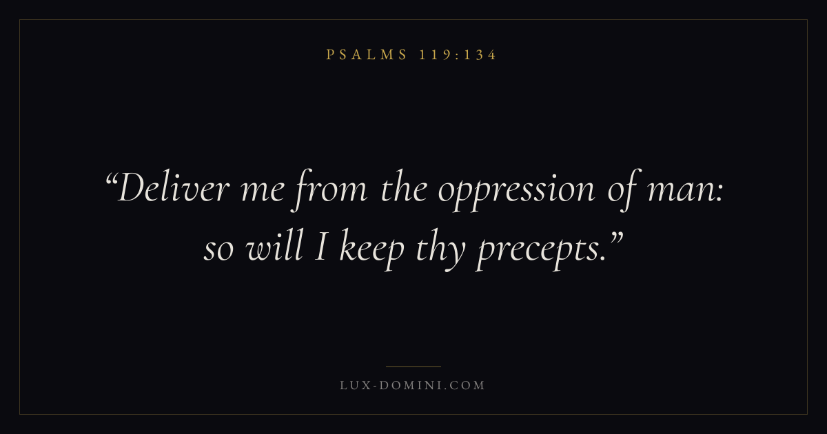 Books / Psalms / Chapter 119 / Verse 134 ← Psalms 119:133 Psalms 119:134 Psalms 119:135 → Deliver me from the oppression of man: so will I keep thy precepts. Download verse card Share on Twitter Share on Facebook Pin it ✦ Key themes LoveFaithPrayerPraise Read with John 3:161 Corinthians 13:4Hebrews 11:1Romans 10:17 Related topics Bible verses about loveBible verses about faithBible verses about prayerBible verses about thankfulness and gratitude ✦ Psalms Chapter 119 verses V. 1 V. 2 V. 3 V. 4 V. 5 V. 6 V. 7 V. 8 V. 9 V. 10 V. 11 V. 12 V. 13 V. 14 V. 15 V. 16 V. 17 V. 18 V. 19 V. 20 V. 21 V. 22 V. 23 V. 24 V. 25 V. 26 V. 27 V. 28 V. 29 V. 30 V. 31 V. 32 V. 33 V. 34 V. 35 V. 36 V. 37 V. 38 V. 39 V. 40 V. 41 V. 42 V. 43 V. 44 V. 45 V. 46 V. 47 V. 48 V. 49 V. 50 V. 51 V. 52 V. 53 V. 54 V. 55 V. 56 V. 57 V. 58 V. 59 V. 60 V. 61 V. 62 V. 63 V. 64 V. 65 V. 66 V. 67 V. 68 V. 69 V. 70 V. 71 V. 72 V. 73 V. 74 V. 75 V. 76 V. 77 V. 78 V. 79 V. 80 V. 81 V. 82 V. 83 V. 84 V. 85 V. 86 V. 87 V. 88 V. 89 V. 90 V. 91 V. 92 V. 93 V. 94 V. 95 V. 96 V. 97 V. 98 V. 99 V. 100 V. 101 V. 102 V. 103 V. 104 V. 105 V. 106 V. 107 V. 108 V. 109 V. 110 V. 111 V. 112 V. 113 V. 114 V. 115 V. 116 V. 117 V. 118 V. 119 V. 120 V. 121 V. 122 V. 123 V. 124 V. 125 V. 126 V. 127 V. 128 V. 129 V. 130 V. 131 V. 132 V. 133 V. 134 V. 135 V. 136 V. 137 V. 138 V. 139 V. 140 V. 141 V. 142 V. 143 V. 144 V. 145 V. 146 V. 147 V. 148 V. 149 V. 150 V. 151 V. 152 V. 153 V. 154 V. 155 V. 156 V. 157 V. 158 V. 159 V. 160 V. 161 V. 162 V. 163 V. 164 V. 165 V. 166 V. 167 V. 168 V. 169 V. 170 V. 171 V. 172 V. 173 V. 174 V. 175 V. 176