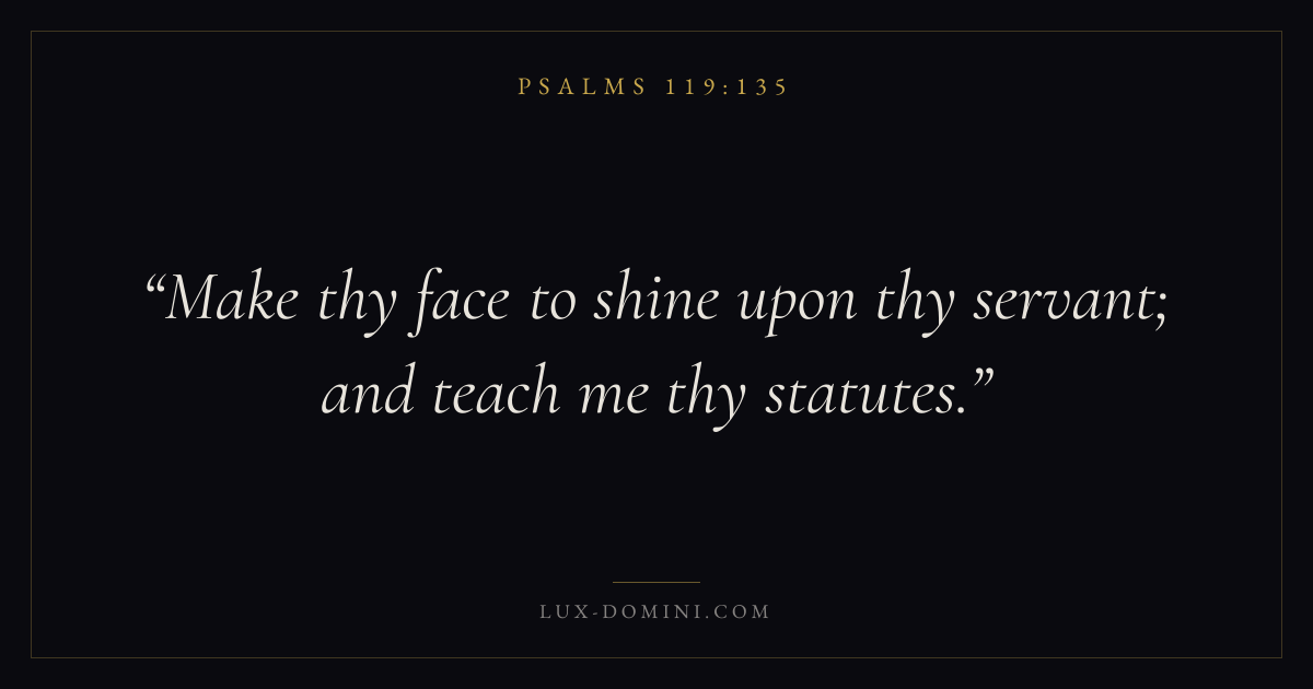 Books / Psalms / Chapter 119 / Verse 135 ← Psalms 119:134 Psalms 119:135 Psalms 119:136 → Make thy face to shine upon thy servant; and teach me thy statutes. Download verse card Share on Twitter Share on Facebook Pin it ✦ Key themes LoveFaithPrayerPraise Read with John 3:161 Corinthians 13:4Hebrews 11:1Romans 10:17 Related topics Bible verses about loveBible verses about faithBible verses about prayerBible verses about thankfulness and gratitude ✦ Psalms Chapter 119 verses V. 1 V. 2 V. 3 V. 4 V. 5 V. 6 V. 7 V. 8 V. 9 V. 10 V. 11 V. 12 V. 13 V. 14 V. 15 V. 16 V. 17 V. 18 V. 19 V. 20 V. 21 V. 22 V. 23 V. 24 V. 25 V. 26 V. 27 V. 28 V. 29 V. 30 V. 31 V. 32 V. 33 V. 34 V. 35 V. 36 V. 37 V. 38 V. 39 V. 40 V. 41 V. 42 V. 43 V. 44 V. 45 V. 46 V. 47 V. 48 V. 49 V. 50 V. 51 V. 52 V. 53 V. 54 V. 55 V. 56 V. 57 V. 58 V. 59 V. 60 V. 61 V. 62 V. 63 V. 64 V. 65 V. 66 V. 67 V. 68 V. 69 V. 70 V. 71 V. 72 V. 73 V. 74 V. 75 V. 76 V. 77 V. 78 V. 79 V. 80 V. 81 V. 82 V. 83 V. 84 V. 85 V. 86 V. 87 V. 88 V. 89 V. 90 V. 91 V. 92 V. 93 V. 94 V. 95 V. 96 V. 97 V. 98 V. 99 V. 100 V. 101 V. 102 V. 103 V. 104 V. 105 V. 106 V. 107 V. 108 V. 109 V. 110 V. 111 V. 112 V. 113 V. 114 V. 115 V. 116 V. 117 V. 118 V. 119 V. 120 V. 121 V. 122 V. 123 V. 124 V. 125 V. 126 V. 127 V. 128 V. 129 V. 130 V. 131 V. 132 V. 133 V. 134 V. 135 V. 136 V. 137 V. 138 V. 139 V. 140 V. 141 V. 142 V. 143 V. 144 V. 145 V. 146 V. 147 V. 148 V. 149 V. 150 V. 151 V. 152 V. 153 V. 154 V. 155 V. 156 V. 157 V. 158 V. 159 V. 160 V. 161 V. 162 V. 163 V. 164 V. 165 V. 166 V. 167 V. 168 V. 169 V. 170 V. 171 V. 172 V. 173 V. 174 V. 175 V. 176