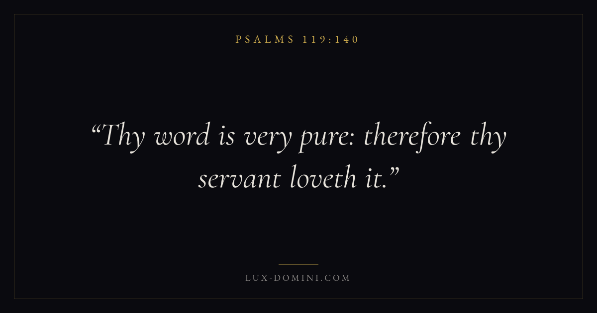 Books / Psalms / Chapter 119 / Verse 140 ← Psalms 119:139 Psalms 119:140 Psalms 119:141 → Thy word is very pure: therefore thy servant loveth it. Download verse card Share on Twitter Share on Facebook Pin it ✦ Key themes LoveFaithPrayerTruthPraise Read with John 3:161 Corinthians 13:4Hebrews 11:1Romans 10:17 Related topics Bible verses about loveBible verses about faithBible verses about prayerBible verses about truthBible verses about thankfulness and gratitude ✦ Psalms Chapter 119 verses V. 1 V. 2 V. 3 V. 4 V. 5 V. 6 V. 7 V. 8 V. 9 V. 10 V. 11 V. 12 V. 13 V. 14 V. 15 V. 16 V. 17 V. 18 V. 19 V. 20 V. 21 V. 22 V. 23 V. 24 V. 25 V. 26 V. 27 V. 28 V. 29 V. 30 V. 31 V. 32 V. 33 V. 34 V. 35 V. 36 V. 37 V. 38 V. 39 V. 40 V. 41 V. 42 V. 43 V. 44 V. 45 V. 46 V. 47 V. 48 V. 49 V. 50 V. 51 V. 52 V. 53 V. 54 V. 55 V. 56 V. 57 V. 58 V. 59 V. 60 V. 61 V. 62 V. 63 V. 64 V. 65 V. 66 V. 67 V. 68 V. 69 V. 70 V. 71 V. 72 V. 73 V. 74 V. 75 V. 76 V. 77 V. 78 V. 79 V. 80 V. 81 V. 82 V. 83 V. 84 V. 85 V. 86 V. 87 V. 88 V. 89 V. 90 V. 91 V. 92 V. 93 V. 94 V. 95 V. 96 V. 97 V. 98 V. 99 V. 100 V. 101 V. 102 V. 103 V. 104 V. 105 V. 106 V. 107 V. 108 V. 109 V. 110 V. 111 V. 112 V. 113 V. 114 V. 115 V. 116 V. 117 V. 118 V. 119 V. 120 V. 121 V. 122 V. 123 V. 124 V. 125 V. 126 V. 127 V. 128 V. 129 V. 130 V. 131 V. 132 V. 133 V. 134 V. 135 V. 136 V. 137 V. 138 V. 139 V. 140 V. 141 V. 142 V. 143 V. 144 V. 145 V. 146 V. 147 V. 148 V. 149 V. 150 V. 151 V. 152 V. 153 V. 154 V. 155 V. 156 V. 157 V. 158 V. 159 V. 160 V. 161 V. 162 V. 163 V. 164 V. 165 V. 166 V. 167 V. 168 V. 169 V. 170 V. 171 V. 172 V. 173 V. 174 V. 175 V. 176