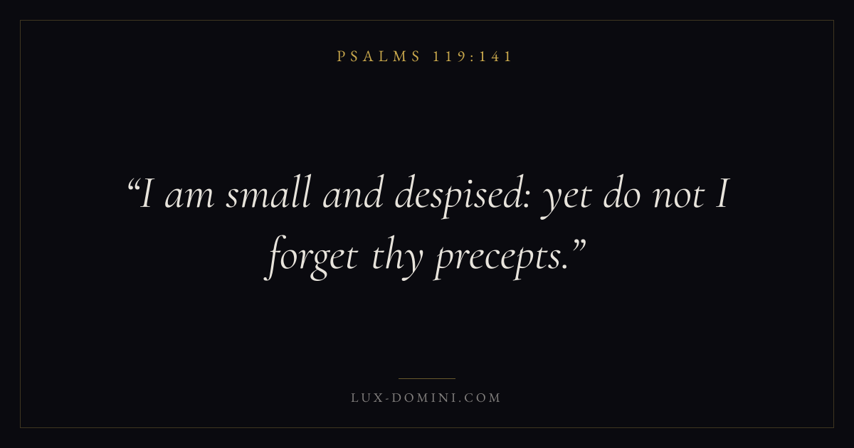 Books / Psalms / Chapter 119 / Verse 141 ← Psalms 119:140 Psalms 119:141 Psalms 119:142 → I am small and despised: yet do not I forget thy precepts. Download verse card Share on Twitter Share on Facebook Pin it ✦ Key themes FaithPrayerPraiseLament Read with Hebrews 11:1Romans 10:17Matthew 6:9Luke 18:1 Related topics Bible verses about faithBible verses about prayerBible verses about thankfulness and gratitudeBible verses about grief and loss ✦ Psalms Chapter 119 verses V. 1 V. 2 V. 3 V. 4 V. 5 V. 6 V. 7 V. 8 V. 9 V. 10 V. 11 V. 12 V. 13 V. 14 V. 15 V. 16 V. 17 V. 18 V. 19 V. 20 V. 21 V. 22 V. 23 V. 24 V. 25 V. 26 V. 27 V. 28 V. 29 V. 30 V. 31 V. 32 V. 33 V. 34 V. 35 V. 36 V. 37 V. 38 V. 39 V. 40 V. 41 V. 42 V. 43 V. 44 V. 45 V. 46 V. 47 V. 48 V. 49 V. 50 V. 51 V. 52 V. 53 V. 54 V. 55 V. 56 V. 57 V. 58 V. 59 V. 60 V. 61 V. 62 V. 63 V. 64 V. 65 V. 66 V. 67 V. 68 V. 69 V. 70 V. 71 V. 72 V. 73 V. 74 V. 75 V. 76 V. 77 V. 78 V. 79 V. 80 V. 81 V. 82 V. 83 V. 84 V. 85 V. 86 V. 87 V. 88 V. 89 V. 90 V. 91 V. 92 V. 93 V. 94 V. 95 V. 96 V. 97 V. 98 V. 99 V. 100 V. 101 V. 102 V. 103 V. 104 V. 105 V. 106 V. 107 V. 108 V. 109 V. 110 V. 111 V. 112 V. 113 V. 114 V. 115 V. 116 V. 117 V. 118 V. 119 V. 120 V. 121 V. 122 V. 123 V. 124 V. 125 V. 126 V. 127 V. 128 V. 129 V. 130 V. 131 V. 132 V. 133 V. 134 V. 135 V. 136 V. 137 V. 138 V. 139 V. 140 V. 141 V. 142 V. 143 V. 144 V. 145 V. 146 V. 147 V. 148 V. 149 V. 150 V. 151 V. 152 V. 153 V. 154 V. 155 V. 156 V. 157 V. 158 V. 159 V. 160 V. 161 V. 162 V. 163 V. 164 V. 165 V. 166 V. 167 V. 168 V. 169 V. 170 V. 171 V. 172 V. 173 V. 174 V. 175 V. 176