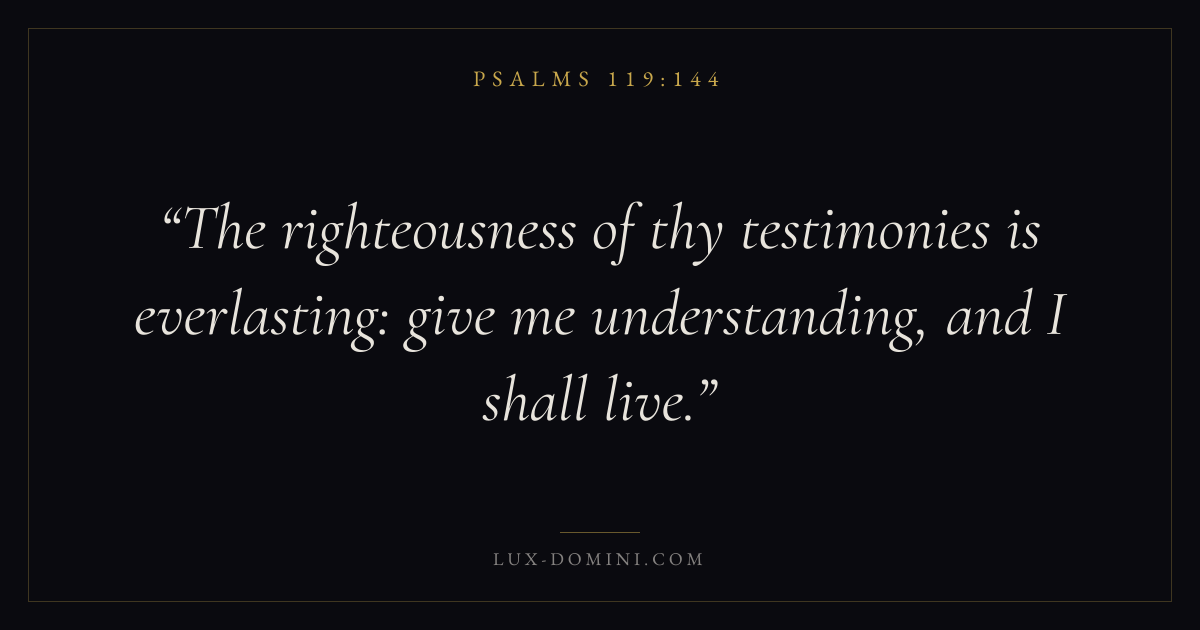 Books / Psalms / Chapter 119 / Verse 144 ← Psalms 119:143 Psalms 119:144 Psalms 119:145 → The righteousness of thy testimonies is everlasting: give me understanding, and I shall live. Download verse card Share on Twitter Share on Facebook Pin it ✦ Key themes FaithPrayerWisdomPraise Read with Hebrews 11:1Romans 10:17Matthew 6:9Luke 18:1 Related topics Bible verses about faithBible verses about prayerBible verses about wisdomBible verses about thankfulness and gratitude ✦ Psalms Chapter 119 verses V. 1 V. 2 V. 3 V. 4 V. 5 V. 6 V. 7 V. 8 V. 9 V. 10 V. 11 V. 12 V. 13 V. 14 V. 15 V. 16 V. 17 V. 18 V. 19 V. 20 V. 21 V. 22 V. 23 V. 24 V. 25 V. 26 V. 27 V. 28 V. 29 V. 30 V. 31 V. 32 V. 33 V. 34 V. 35 V. 36 V. 37 V. 38 V. 39 V. 40 V. 41 V. 42 V. 43 V. 44 V. 45 V. 46 V. 47 V. 48 V. 49 V. 50 V. 51 V. 52 V. 53 V. 54 V. 55 V. 56 V. 57 V. 58 V. 59 V. 60 V. 61 V. 62 V. 63 V. 64 V. 65 V. 66 V. 67 V. 68 V. 69 V. 70 V. 71 V. 72 V. 73 V. 74 V. 75 V. 76 V. 77 V. 78 V. 79 V. 80 V. 81 V. 82 V. 83 V. 84 V. 85 V. 86 V. 87 V. 88 V. 89 V. 90 V. 91 V. 92 V. 93 V. 94 V. 95 V. 96 V. 97 V. 98 V. 99 V. 100 V. 101 V. 102 V. 103 V. 104 V. 105 V. 106 V. 107 V. 108 V. 109 V. 110 V. 111 V. 112 V. 113 V. 114 V. 115 V. 116 V. 117 V. 118 V. 119 V. 120 V. 121 V. 122 V. 123 V. 124 V. 125 V. 126 V. 127 V. 128 V. 129 V. 130 V. 131 V. 132 V. 133 V. 134 V. 135 V. 136 V. 137 V. 138 V. 139 V. 140 V. 141 V. 142 V. 143 V. 144 V. 145 V. 146 V. 147 V. 148 V. 149 V. 150 V. 151 V. 152 V. 153 V. 154 V. 155 V. 156 V. 157 V. 158 V. 159 V. 160 V. 161 V. 162 V. 163 V. 164 V. 165 V. 166 V. 167 V. 168 V. 169 V. 170 V. 171 V. 172 V. 173 V. 174 V. 175 V. 176
