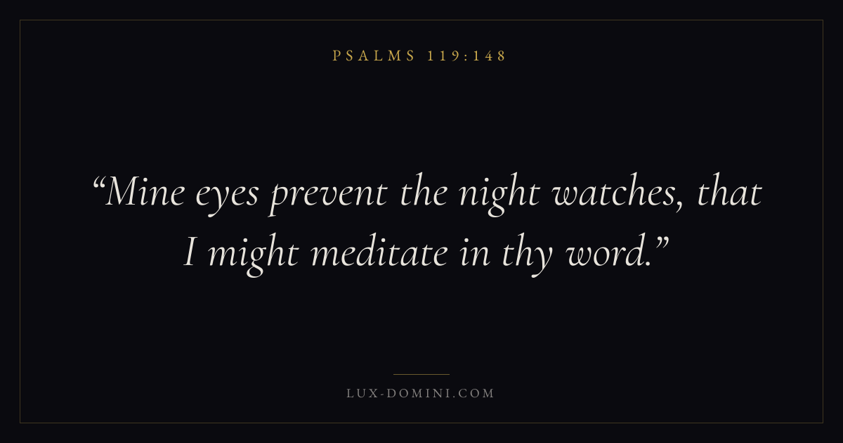 Books / Psalms / Chapter 119 / Verse 148 ← Psalms 119:147 Psalms 119:148 Psalms 119:149 → Mine eyes prevent the night watches, that I might meditate in thy word. Download verse card Share on Twitter Share on Facebook Pin it ✦ Key themes LoveFaithPrayerSalvationPraise Read with John 3:161 Corinthians 13:4Hebrews 11:1Romans 10:17 Related topics Bible verses about loveBible verses about faithBible verses about prayerBible verses about salvationBible verses about thankfulness and gratitude ✦ Psalms Chapter 119 verses V. 1 V. 2 V. 3 V. 4 V. 5 V. 6 V. 7 V. 8 V. 9 V. 10 V. 11 V. 12 V. 13 V. 14 V. 15 V. 16 V. 17 V. 18 V. 19 V. 20 V. 21 V. 22 V. 23 V. 24 V. 25 V. 26 V. 27 V. 28 V. 29 V. 30 V. 31 V. 32 V. 33 V. 34 V. 35 V. 36 V. 37 V. 38 V. 39 V. 40 V. 41 V. 42 V. 43 V. 44 V. 45 V. 46 V. 47 V. 48 V. 49 V. 50 V. 51 V. 52 V. 53 V. 54 V. 55 V. 56 V. 57 V. 58 V. 59 V. 60 V. 61 V. 62 V. 63 V. 64 V. 65 V. 66 V. 67 V. 68 V. 69 V. 70 V. 71 V. 72 V. 73 V. 74 V. 75 V. 76 V. 77 V. 78 V. 79 V. 80 V. 81 V. 82 V. 83 V. 84 V. 85 V. 86 V. 87 V. 88 V. 89 V. 90 V. 91 V. 92 V. 93 V. 94 V. 95 V. 96 V. 97 V. 98 V. 99 V. 100 V. 101 V. 102 V. 103 V. 104 V. 105 V. 106 V. 107 V. 108 V. 109 V. 110 V. 111 V. 112 V. 113 V. 114 V. 115 V. 116 V. 117 V. 118 V. 119 V. 120 V. 121 V. 122 V. 123 V. 124 V. 125 V. 126 V. 127 V. 128 V. 129 V. 130 V. 131 V. 132 V. 133 V. 134 V. 135 V. 136 V. 137 V. 138 V. 139 V. 140 V. 141 V. 142 V. 143 V. 144 V. 145 V. 146 V. 147 V. 148 V. 149 V. 150 V. 151 V. 152 V. 153 V. 154 V. 155 V. 156 V. 157 V. 158 V. 159 V. 160 V. 161 V. 162 V. 163 V. 164 V. 165 V. 166 V. 167 V. 168 V. 169 V. 170 V. 171 V. 172 V. 173 V. 174 V. 175 V. 176