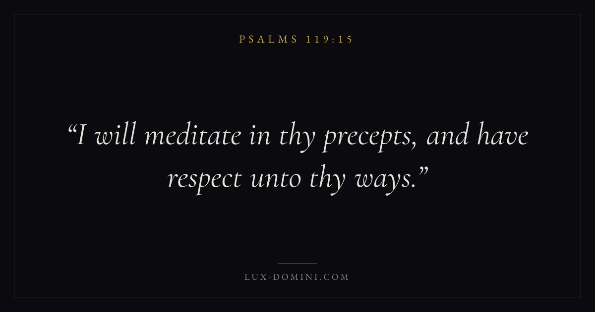 Books / Psalms / Chapter 119 / Verse 15 ← Psalms 119:14 Psalms 119:15 Psalms 119:16 → I will meditate in thy precepts, and have respect unto thy ways. Download verse card Share on Twitter Share on Facebook Pin it ✦ Key themes FaithPrayerPraiseLament Read with Hebrews 11:1Romans 10:17Matthew 6:9Luke 18:1 Related topics Bible verses about faithBible verses about prayerBible verses about thankfulness and gratitudeBible verses about grief and loss ✦ Psalms Chapter 119 verses V. 1 V. 2 V. 3 V. 4 V. 5 V. 6 V. 7 V. 8 V. 9 V. 10 V. 11 V. 12 V. 13 V. 14 V. 15 V. 16 V. 17 V. 18 V. 19 V. 20 V. 21 V. 22 V. 23 V. 24 V. 25 V. 26 V. 27 V. 28 V. 29 V. 30 V. 31 V. 32 V. 33 V. 34 V. 35 V. 36 V. 37 V. 38 V. 39 V. 40 V. 41 V. 42 V. 43 V. 44 V. 45 V. 46 V. 47 V. 48 V. 49 V. 50 V. 51 V. 52 V. 53 V. 54 V. 55 V. 56 V. 57 V. 58 V. 59 V. 60 V. 61 V. 62 V. 63 V. 64 V. 65 V. 66 V. 67 V. 68 V. 69 V. 70 V. 71 V. 72 V. 73 V. 74 V. 75 V. 76 V. 77 V. 78 V. 79 V. 80 V. 81 V. 82 V. 83 V. 84 V. 85 V. 86 V. 87 V. 88 V. 89 V. 90 V. 91 V. 92 V. 93 V. 94 V. 95 V. 96 V. 97 V. 98 V. 99 V. 100 V. 101 V. 102 V. 103 V. 104 V. 105 V. 106 V. 107 V. 108 V. 109 V. 110 V. 111 V. 112 V. 113 V. 114 V. 115 V. 116 V. 117 V. 118 V. 119 V. 120 V. 121 V. 122 V. 123 V. 124 V. 125 V. 126 V. 127 V. 128 V. 129 V. 130 V. 131 V. 132 V. 133 V. 134 V. 135 V. 136 V. 137 V. 138 V. 139 V. 140 V. 141 V. 142 V. 143 V. 144 V. 145 V. 146 V. 147 V. 148 V. 149 V. 150 V. 151 V. 152 V. 153 V. 154 V. 155 V. 156 V. 157 V. 158 V. 159 V. 160 V. 161 V. 162 V. 163 V. 164 V. 165 V. 166 V. 167 V. 168 V. 169 V. 170 V. 171 V. 172 V. 173 V. 174 V. 175 V. 176