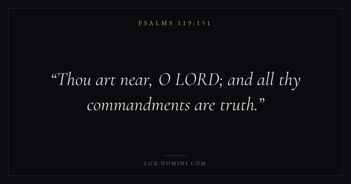 Books / Psalms / Chapter 119 / Verse 151 ← Psalms 119:150 Psalms 119:151 Psalms 119:152 → Thou art near, O LORD; and all thy commandments are truth. Download verse card Share on Twitter Share on Facebook Pin it ✦ Key themes LoveFaithPrayerSalvationPraise Read with John 3:161 Corinthians 13:4Hebrews 11:1Romans 10:17 Related topics Bible verses about loveBible verses about faithBible verses about prayerBible verses about salvationBible verses about thankfulness and gratitude ✦ Psalms Chapter 119 verses V. 1 V. 2 V. 3 V. 4 V. 5 V. 6 V. 7 V. 8 V. 9 V. 10 V. 11 V. 12 V. 13 V. 14 V. 15 V. 16 V. 17 V. 18 V. 19 V. 20 V. 21 V. 22 V. 23 V. 24 V. 25 V. 26 V. 27 V. 28 V. 29 V. 30 V. 31 V. 32 V. 33 V. 34 V. 35 V. 36 V. 37 V. 38 V. 39 V. 40 V. 41 V. 42 V. 43 V. 44 V. 45 V. 46 V. 47 V. 48 V. 49 V. 50 V. 51 V. 52 V. 53 V. 54 V. 55 V. 56 V. 57 V. 58 V. 59 V. 60 V. 61 V. 62 V. 63 V. 64 V. 65 V. 66 V. 67 V. 68 V. 69 V. 70 V. 71 V. 72 V. 73 V. 74 V. 75 V. 76 V. 77 V. 78 V. 79 V. 80 V. 81 V. 82 V. 83 V. 84 V. 85 V. 86 V. 87 V. 88 V. 89 V. 90 V. 91 V. 92 V. 93 V. 94 V. 95 V. 96 V. 97 V. 98 V. 99 V. 100 V. 101 V. 102 V. 103 V. 104 V. 105 V. 106 V. 107 V. 108 V. 109 V. 110 V. 111 V. 112 V. 113 V. 114 V. 115 V. 116 V. 117 V. 118 V. 119 V. 120 V. 121 V. 122 V. 123 V. 124 V. 125 V. 126 V. 127 V. 128 V. 129 V. 130 V. 131 V. 132 V. 133 V. 134 V. 135 V. 136 V. 137 V. 138 V. 139 V. 140 V. 141 V. 142 V. 143 V. 144 V. 145 V. 146 V. 147 V. 148 V. 149 V. 150 V. 151 V. 152 V. 153 V. 154 V. 155 V. 156 V. 157 V. 158 V. 159 V. 160 V. 161 V. 162 V. 163 V. 164 V. 165 V. 166 V. 167 V. 168 V. 169 V. 170 V. 171 V. 172 V. 173 V. 174 V. 175 V. 176