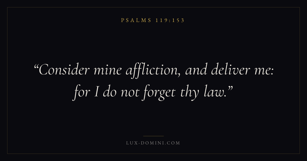 Books / Psalms / Chapter 119 / Verse 153 ← Psalms 119:152 Psalms 119:153 Psalms 119:154 → Consider mine affliction, and deliver me: for I do not forget thy law. Download verse card Share on Twitter Share on Facebook Pin it ✦ Key themes FaithSuffering and trialsPrayerSalvationPraise Read with Hebrews 11:1Romans 10:17Romans 8:182 Corinthians 4:17 Related topics Bible verses about faithBible verses about suffering and trialsBible verses about prayerBible verses about salvationBible verses about thankfulness and gratitude ✦ Psalms Chapter 119 verses V. 1 V. 2 V. 3 V. 4 V. 5 V. 6 V. 7 V. 8 V. 9 V. 10 V. 11 V. 12 V. 13 V. 14 V. 15 V. 16 V. 17 V. 18 V. 19 V. 20 V. 21 V. 22 V. 23 V. 24 V. 25 V. 26 V. 27 V. 28 V. 29 V. 30 V. 31 V. 32 V. 33 V. 34 V. 35 V. 36 V. 37 V. 38 V. 39 V. 40 V. 41 V. 42 V. 43 V. 44 V. 45 V. 46 V. 47 V. 48 V. 49 V. 50 V. 51 V. 52 V. 53 V. 54 V. 55 V. 56 V. 57 V. 58 V. 59 V. 60 V. 61 V. 62 V. 63 V. 64 V. 65 V. 66 V. 67 V. 68 V. 69 V. 70 V. 71 V. 72 V. 73 V. 74 V. 75 V. 76 V. 77 V. 78 V. 79 V. 80 V. 81 V. 82 V. 83 V. 84 V. 85 V. 86 V. 87 V. 88 V. 89 V. 90 V. 91 V. 92 V. 93 V. 94 V. 95 V. 96 V. 97 V. 98 V. 99 V. 100 V. 101 V. 102 V. 103 V. 104 V. 105 V. 106 V. 107 V. 108 V. 109 V. 110 V. 111 V. 112 V. 113 V. 114 V. 115 V. 116 V. 117 V. 118 V. 119 V. 120 V. 121 V. 122 V. 123 V. 124 V. 125 V. 126 V. 127 V. 128 V. 129 V. 130 V. 131 V. 132 V. 133 V. 134 V. 135 V. 136 V. 137 V. 138 V. 139 V. 140 V. 141 V. 142 V. 143 V. 144 V. 145 V. 146 V. 147 V. 148 V. 149 V. 150 V. 151 V. 152 V. 153 V. 154 V. 155 V. 156 V. 157 V. 158 V. 159 V. 160 V. 161 V. 162 V. 163 V. 164 V. 165 V. 166 V. 167 V. 168 V. 169 V. 170 V. 171 V. 172 V. 173 V. 174 V. 175 V. 176