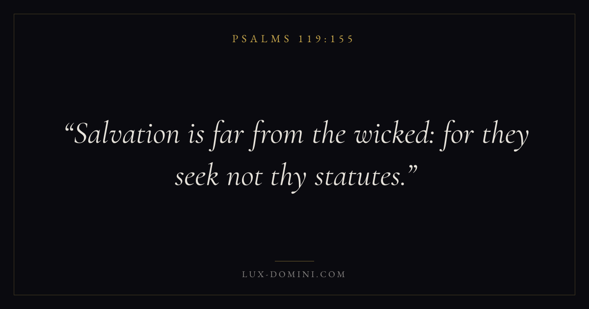 Books / Psalms / Chapter 119 / Verse 155 ← Psalms 119:154 Psalms 119:155 Psalms 119:156 → Salvation is far from the wicked: for they seek not thy statutes. Download verse card Share on Twitter Share on Facebook Pin it ✦ Key themes FaithPrayerSalvationTruthPraise Read with Hebrews 11:1Romans 10:17Matthew 6:9Luke 18:1 Related topics Bible verses about faithBible verses about prayerBible verses about salvationBible verses about truthBible verses about thankfulness and gratitude ✦ Psalms Chapter 119 verses V. 1 V. 2 V. 3 V. 4 V. 5 V. 6 V. 7 V. 8 V. 9 V. 10 V. 11 V. 12 V. 13 V. 14 V. 15 V. 16 V. 17 V. 18 V. 19 V. 20 V. 21 V. 22 V. 23 V. 24 V. 25 V. 26 V. 27 V. 28 V. 29 V. 30 V. 31 V. 32 V. 33 V. 34 V. 35 V. 36 V. 37 V. 38 V. 39 V. 40 V. 41 V. 42 V. 43 V. 44 V. 45 V. 46 V. 47 V. 48 V. 49 V. 50 V. 51 V. 52 V. 53 V. 54 V. 55 V. 56 V. 57 V. 58 V. 59 V. 60 V. 61 V. 62 V. 63 V. 64 V. 65 V. 66 V. 67 V. 68 V. 69 V. 70 V. 71 V. 72 V. 73 V. 74 V. 75 V. 76 V. 77 V. 78 V. 79 V. 80 V. 81 V. 82 V. 83 V. 84 V. 85 V. 86 V. 87 V. 88 V. 89 V. 90 V. 91 V. 92 V. 93 V. 94 V. 95 V. 96 V. 97 V. 98 V. 99 V. 100 V. 101 V. 102 V. 103 V. 104 V. 105 V. 106 V. 107 V. 108 V. 109 V. 110 V. 111 V. 112 V. 113 V. 114 V. 115 V. 116 V. 117 V. 118 V. 119 V. 120 V. 121 V. 122 V. 123 V. 124 V. 125 V. 126 V. 127 V. 128 V. 129 V. 130 V. 131 V. 132 V. 133 V. 134 V. 135 V. 136 V. 137 V. 138 V. 139 V. 140 V. 141 V. 142 V. 143 V. 144 V. 145 V. 146 V. 147 V. 148 V. 149 V. 150 V. 151 V. 152 V. 153 V. 154 V. 155 V. 156 V. 157 V. 158 V. 159 V. 160 V. 161 V. 162 V. 163 V. 164 V. 165 V. 166 V. 167 V. 168 V. 169 V. 170 V. 171 V. 172 V. 173 V. 174 V. 175 V. 176