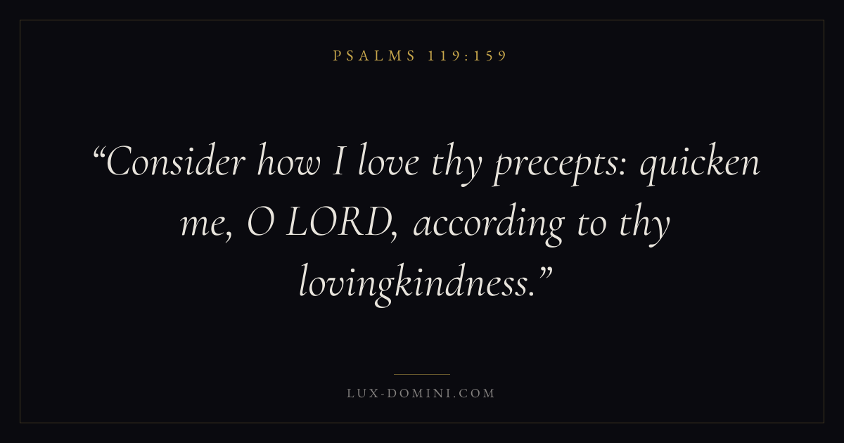 Books / Psalms / Chapter 119 / Verse 159 ← Psalms 119:158 Psalms 119:159 Psalms 119:160 → Consider how I love thy precepts: quicken me, O LORD, according to thy lovingkindness. Download verse card Share on Twitter Share on Facebook Pin it ✦ Key themes LoveFaithPrayerSalvationPraise Read with John 3:161 Corinthians 13:4Hebrews 11:1Romans 10:17 Related topics Bible verses about loveBible verses about faithBible verses about prayerBible verses about salvationBible verses about thankfulness and gratitude ✦ Psalms Chapter 119 verses V. 1 V. 2 V. 3 V. 4 V. 5 V. 6 V. 7 V. 8 V. 9 V. 10 V. 11 V. 12 V. 13 V. 14 V. 15 V. 16 V. 17 V. 18 V. 19 V. 20 V. 21 V. 22 V. 23 V. 24 V. 25 V. 26 V. 27 V. 28 V. 29 V. 30 V. 31 V. 32 V. 33 V. 34 V. 35 V. 36 V. 37 V. 38 V. 39 V. 40 V. 41 V. 42 V. 43 V. 44 V. 45 V. 46 V. 47 V. 48 V. 49 V. 50 V. 51 V. 52 V. 53 V. 54 V. 55 V. 56 V. 57 V. 58 V. 59 V. 60 V. 61 V. 62 V. 63 V. 64 V. 65 V. 66 V. 67 V. 68 V. 69 V. 70 V. 71 V. 72 V. 73 V. 74 V. 75 V. 76 V. 77 V. 78 V. 79 V. 80 V. 81 V. 82 V. 83 V. 84 V. 85 V. 86 V. 87 V. 88 V. 89 V. 90 V. 91 V. 92 V. 93 V. 94 V. 95 V. 96 V. 97 V. 98 V. 99 V. 100 V. 101 V. 102 V. 103 V. 104 V. 105 V. 106 V. 107 V. 108 V. 109 V. 110 V. 111 V. 112 V. 113 V. 114 V. 115 V. 116 V. 117 V. 118 V. 119 V. 120 V. 121 V. 122 V. 123 V. 124 V. 125 V. 126 V. 127 V. 128 V. 129 V. 130 V. 131 V. 132 V. 133 V. 134 V. 135 V. 136 V. 137 V. 138 V. 139 V. 140 V. 141 V. 142 V. 143 V. 144 V. 145 V. 146 V. 147 V. 148 V. 149 V. 150 V. 151 V. 152 V. 153 V. 154 V. 155 V. 156 V. 157 V. 158 V. 159 V. 160 V. 161 V. 162 V. 163 V. 164 V. 165 V. 166 V. 167 V. 168 V. 169 V. 170 V. 171 V. 172 V. 173 V. 174 V. 175 V. 176