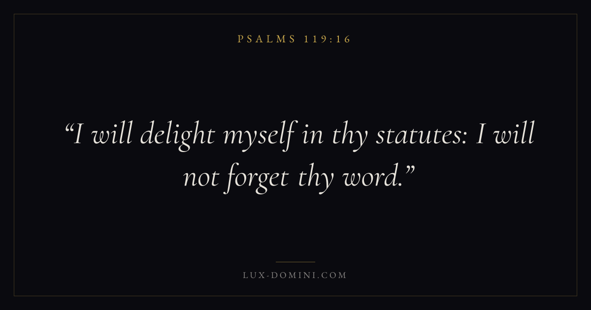 Books / Psalms / Chapter 119 / Verse 16 ← Psalms 119:15 Psalms 119:16 Psalms 119:17 → I will delight myself in thy statutes: I will not forget thy word. Download verse card Share on Twitter Share on Facebook Pin it ✦ Key themes FaithPrayerTruthPraise Read with Hebrews 11:1Romans 10:17Matthew 6:9Luke 18:1 Related topics Bible verses about faithBible verses about prayerBible verses about truthBible verses about thankfulness and gratitude ✦ Psalms Chapter 119 verses V. 1 V. 2 V. 3 V. 4 V. 5 V. 6 V. 7 V. 8 V. 9 V. 10 V. 11 V. 12 V. 13 V. 14 V. 15 V. 16 V. 17 V. 18 V. 19 V. 20 V. 21 V. 22 V. 23 V. 24 V. 25 V. 26 V. 27 V. 28 V. 29 V. 30 V. 31 V. 32 V. 33 V. 34 V. 35 V. 36 V. 37 V. 38 V. 39 V. 40 V. 41 V. 42 V. 43 V. 44 V. 45 V. 46 V. 47 V. 48 V. 49 V. 50 V. 51 V. 52 V. 53 V. 54 V. 55 V. 56 V. 57 V. 58 V. 59 V. 60 V. 61 V. 62 V. 63 V. 64 V. 65 V. 66 V. 67 V. 68 V. 69 V. 70 V. 71 V. 72 V. 73 V. 74 V. 75 V. 76 V. 77 V. 78 V. 79 V. 80 V. 81 V. 82 V. 83 V. 84 V. 85 V. 86 V. 87 V. 88 V. 89 V. 90 V. 91 V. 92 V. 93 V. 94 V. 95 V. 96 V. 97 V. 98 V. 99 V. 100 V. 101 V. 102 V. 103 V. 104 V. 105 V. 106 V. 107 V. 108 V. 109 V. 110 V. 111 V. 112 V. 113 V. 114 V. 115 V. 116 V. 117 V. 118 V. 119 V. 120 V. 121 V. 122 V. 123 V. 124 V. 125 V. 126 V. 127 V. 128 V. 129 V. 130 V. 131 V. 132 V. 133 V. 134 V. 135 V. 136 V. 137 V. 138 V. 139 V. 140 V. 141 V. 142 V. 143 V. 144 V. 145 V. 146 V. 147 V. 148 V. 149 V. 150 V. 151 V. 152 V. 153 V. 154 V. 155 V. 156 V. 157 V. 158 V. 159 V. 160 V. 161 V. 162 V. 163 V. 164 V. 165 V. 166 V. 167 V. 168 V. 169 V. 170 V. 171 V. 172 V. 173 V. 174 V. 175 V. 176