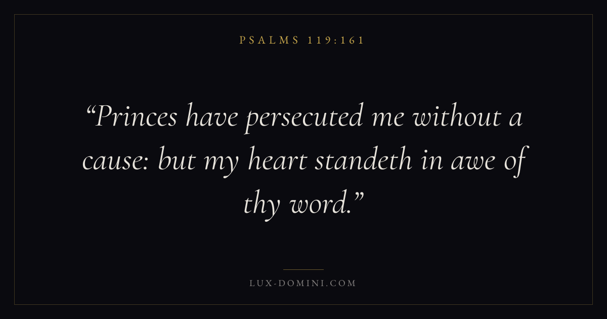 Books / Psalms / Chapter 119 / Verse 161 ← Psalms 119:160 Psalms 119:161 Psalms 119:162 → Princes have persecuted me without a cause: but my heart standeth in awe of thy word. Download verse card Share on Twitter Share on Facebook Pin it ✦ Key themes FaithPrayerTruthPraise Read with Hebrews 11:1Romans 10:17Matthew 6:9Luke 18:1 Related topics Bible verses about faithBible verses about prayerBible verses about truthBible verses about thankfulness and gratitude ✦ Psalms Chapter 119 verses V. 1 V. 2 V. 3 V. 4 V. 5 V. 6 V. 7 V. 8 V. 9 V. 10 V. 11 V. 12 V. 13 V. 14 V. 15 V. 16 V. 17 V. 18 V. 19 V. 20 V. 21 V. 22 V. 23 V. 24 V. 25 V. 26 V. 27 V. 28 V. 29 V. 30 V. 31 V. 32 V. 33 V. 34 V. 35 V. 36 V. 37 V. 38 V. 39 V. 40 V. 41 V. 42 V. 43 V. 44 V. 45 V. 46 V. 47 V. 48 V. 49 V. 50 V. 51 V. 52 V. 53 V. 54 V. 55 V. 56 V. 57 V. 58 V. 59 V. 60 V. 61 V. 62 V. 63 V. 64 V. 65 V. 66 V. 67 V. 68 V. 69 V. 70 V. 71 V. 72 V. 73 V. 74 V. 75 V. 76 V. 77 V. 78 V. 79 V. 80 V. 81 V. 82 V. 83 V. 84 V. 85 V. 86 V. 87 V. 88 V. 89 V. 90 V. 91 V. 92 V. 93 V. 94 V. 95 V. 96 V. 97 V. 98 V. 99 V. 100 V. 101 V. 102 V. 103 V. 104 V. 105 V. 106 V. 107 V. 108 V. 109 V. 110 V. 111 V. 112 V. 113 V. 114 V. 115 V. 116 V. 117 V. 118 V. 119 V. 120 V. 121 V. 122 V. 123 V. 124 V. 125 V. 126 V. 127 V. 128 V. 129 V. 130 V. 131 V. 132 V. 133 V. 134 V. 135 V. 136 V. 137 V. 138 V. 139 V. 140 V. 141 V. 142 V. 143 V. 144 V. 145 V. 146 V. 147 V. 148 V. 149 V. 150 V. 151 V. 152 V. 153 V. 154 V. 155 V. 156 V. 157 V. 158 V. 159 V. 160 V. 161 V. 162 V. 163 V. 164 V. 165 V. 166 V. 167 V. 168 V. 169 V. 170 V. 171 V. 172 V. 173 V. 174 V. 175 V. 176