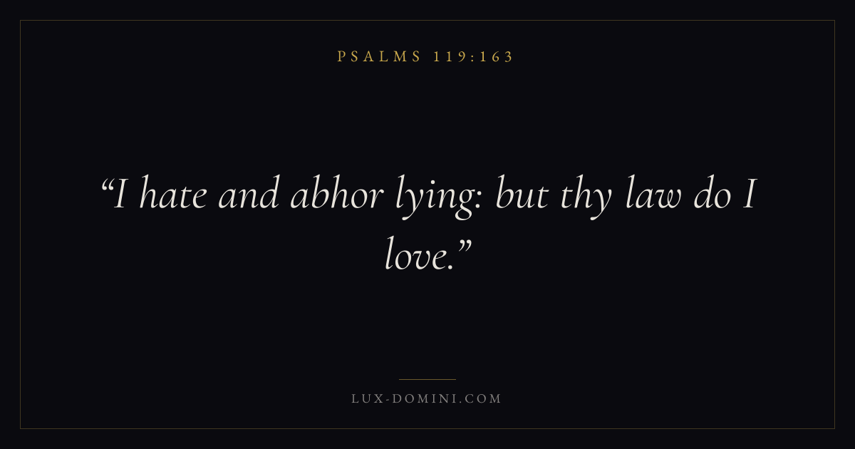 Books / Psalms / Chapter 119 / Verse 163 ← Psalms 119:162 Psalms 119:163 Psalms 119:164 → I hate and abhor lying: but thy law do I love. Download verse card Share on Twitter Share on Facebook Pin it ✦ Key themes LoveFaithPrayerTruthPraise Read with John 3:161 Corinthians 13:4Hebrews 11:1Romans 10:17 Related topics Bible verses about loveBible verses about faithBible verses about prayerBible verses about truthBible verses about thankfulness and gratitude ✦ Psalms Chapter 119 verses V. 1 V. 2 V. 3 V. 4 V. 5 V. 6 V. 7 V. 8 V. 9 V. 10 V. 11 V. 12 V. 13 V. 14 V. 15 V. 16 V. 17 V. 18 V. 19 V. 20 V. 21 V. 22 V. 23 V. 24 V. 25 V. 26 V. 27 V. 28 V. 29 V. 30 V. 31 V. 32 V. 33 V. 34 V. 35 V. 36 V. 37 V. 38 V. 39 V. 40 V. 41 V. 42 V. 43 V. 44 V. 45 V. 46 V. 47 V. 48 V. 49 V. 50 V. 51 V. 52 V. 53 V. 54 V. 55 V. 56 V. 57 V. 58 V. 59 V. 60 V. 61 V. 62 V. 63 V. 64 V. 65 V. 66 V. 67 V. 68 V. 69 V. 70 V. 71 V. 72 V. 73 V. 74 V. 75 V. 76 V. 77 V. 78 V. 79 V. 80 V. 81 V. 82 V. 83 V. 84 V. 85 V. 86 V. 87 V. 88 V. 89 V. 90 V. 91 V. 92 V. 93 V. 94 V. 95 V. 96 V. 97 V. 98 V. 99 V. 100 V. 101 V. 102 V. 103 V. 104 V. 105 V. 106 V. 107 V. 108 V. 109 V. 110 V. 111 V. 112 V. 113 V. 114 V. 115 V. 116 V. 117 V. 118 V. 119 V. 120 V. 121 V. 122 V. 123 V. 124 V. 125 V. 126 V. 127 V. 128 V. 129 V. 130 V. 131 V. 132 V. 133 V. 134 V. 135 V. 136 V. 137 V. 138 V. 139 V. 140 V. 141 V. 142 V. 143 V. 144 V. 145 V. 146 V. 147 V. 148 V. 149 V. 150 V. 151 V. 152 V. 153 V. 154 V. 155 V. 156 V. 157 V. 158 V. 159 V. 160 V. 161 V. 162 V. 163 V. 164 V. 165 V. 166 V. 167 V. 168 V. 169 V. 170 V. 171 V. 172 V. 173 V. 174 V. 175 V. 176