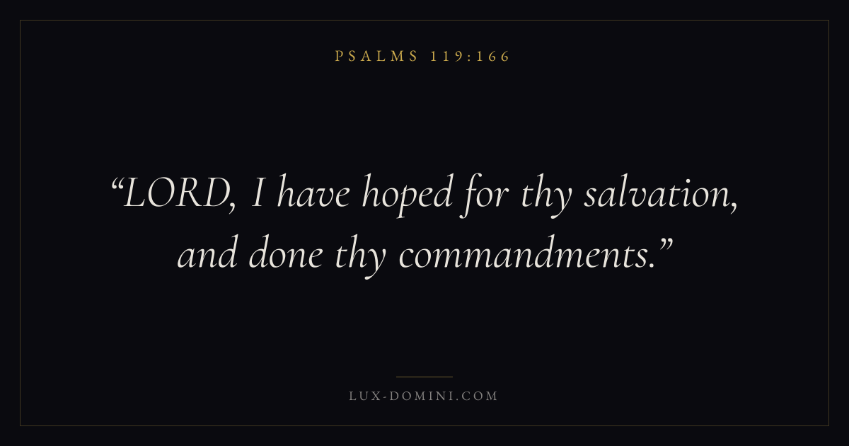 Books / Psalms / Chapter 119 / Verse 166 ← Psalms 119:165 Psalms 119:166 Psalms 119:167 → LORD, I have hoped for thy salvation, and done thy commandments. Download verse card Share on Twitter Share on Facebook Pin it ✦ Key themes FaithPrayerSalvationTruthPraise Read with Hebrews 11:1Romans 10:17Matthew 6:9Luke 18:1 Related topics Bible verses about faithBible verses about prayerBible verses about salvationBible verses about truthBible verses about thankfulness and gratitude ✦ Psalms Chapter 119 verses V. 1 V. 2 V. 3 V. 4 V. 5 V. 6 V. 7 V. 8 V. 9 V. 10 V. 11 V. 12 V. 13 V. 14 V. 15 V. 16 V. 17 V. 18 V. 19 V. 20 V. 21 V. 22 V. 23 V. 24 V. 25 V. 26 V. 27 V. 28 V. 29 V. 30 V. 31 V. 32 V. 33 V. 34 V. 35 V. 36 V. 37 V. 38 V. 39 V. 40 V. 41 V. 42 V. 43 V. 44 V. 45 V. 46 V. 47 V. 48 V. 49 V. 50 V. 51 V. 52 V. 53 V. 54 V. 55 V. 56 V. 57 V. 58 V. 59 V. 60 V. 61 V. 62 V. 63 V. 64 V. 65 V. 66 V. 67 V. 68 V. 69 V. 70 V. 71 V. 72 V. 73 V. 74 V. 75 V. 76 V. 77 V. 78 V. 79 V. 80 V. 81 V. 82 V. 83 V. 84 V. 85 V. 86 V. 87 V. 88 V. 89 V. 90 V. 91 V. 92 V. 93 V. 94 V. 95 V. 96 V. 97 V. 98 V. 99 V. 100 V. 101 V. 102 V. 103 V. 104 V. 105 V. 106 V. 107 V. 108 V. 109 V. 110 V. 111 V. 112 V. 113 V. 114 V. 115 V. 116 V. 117 V. 118 V. 119 V. 120 V. 121 V. 122 V. 123 V. 124 V. 125 V. 126 V. 127 V. 128 V. 129 V. 130 V. 131 V. 132 V. 133 V. 134 V. 135 V. 136 V. 137 V. 138 V. 139 V. 140 V. 141 V. 142 V. 143 V. 144 V. 145 V. 146 V. 147 V. 148 V. 149 V. 150 V. 151 V. 152 V. 153 V. 154 V. 155 V. 156 V. 157 V. 158 V. 159 V. 160 V. 161 V. 162 V. 163 V. 164 V. 165 V. 166 V. 167 V. 168 V. 169 V. 170 V. 171 V. 172 V. 173 V. 174 V. 175 V. 176