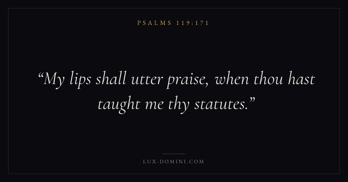 Books / Psalms / Chapter 119 / Verse 171 ← Psalms 119:170 Psalms 119:171 Psalms 119:172 → My lips shall utter praise, when thou hast taught me thy statutes. Download verse card Share on Twitter Share on Facebook Pin it ✦ Key themes FaithPrayerGraceTruthPraise Read with Hebrews 11:1Romans 10:17Matthew 6:9Luke 18:1 Related topics Bible verses about faithBible verses about prayerBible verses about graceBible verses about truthBible verses about thankfulness and gratitude ✦ Psalms Chapter 119 verses V. 1 V. 2 V. 3 V. 4 V. 5 V. 6 V. 7 V. 8 V. 9 V. 10 V. 11 V. 12 V. 13 V. 14 V. 15 V. 16 V. 17 V. 18 V. 19 V. 20 V. 21 V. 22 V. 23 V. 24 V. 25 V. 26 V. 27 V. 28 V. 29 V. 30 V. 31 V. 32 V. 33 V. 34 V. 35 V. 36 V. 37 V. 38 V. 39 V. 40 V. 41 V. 42 V. 43 V. 44 V. 45 V. 46 V. 47 V. 48 V. 49 V. 50 V. 51 V. 52 V. 53 V. 54 V. 55 V. 56 V. 57 V. 58 V. 59 V. 60 V. 61 V. 62 V. 63 V. 64 V. 65 V. 66 V. 67 V. 68 V. 69 V. 70 V. 71 V. 72 V. 73 V. 74 V. 75 V. 76 V. 77 V. 78 V. 79 V. 80 V. 81 V. 82 V. 83 V. 84 V. 85 V. 86 V. 87 V. 88 V. 89 V. 90 V. 91 V. 92 V. 93 V. 94 V. 95 V. 96 V. 97 V. 98 V. 99 V. 100 V. 101 V. 102 V. 103 V. 104 V. 105 V. 106 V. 107 V. 108 V. 109 V. 110 V. 111 V. 112 V. 113 V. 114 V. 115 V. 116 V. 117 V. 118 V. 119 V. 120 V. 121 V. 122 V. 123 V. 124 V. 125 V. 126 V. 127 V. 128 V. 129 V. 130 V. 131 V. 132 V. 133 V. 134 V. 135 V. 136 V. 137 V. 138 V. 139 V. 140 V. 141 V. 142 V. 143 V. 144 V. 145 V. 146 V. 147 V. 148 V. 149 V. 150 V. 151 V. 152 V. 153 V. 154 V. 155 V. 156 V. 157 V. 158 V. 159 V. 160 V. 161 V. 162 V. 163 V. 164 V. 165 V. 166 V. 167 V. 168 V. 169 V. 170 V. 171 V. 172 V. 173 V. 174 V. 175 V. 176