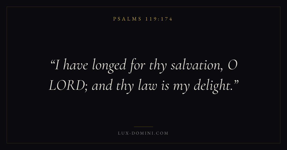 Books / Psalms / Chapter 119 / Verse 174 ← Psalms 119:173 Psalms 119:174 Psalms 119:175 → I have longed for thy salvation, O LORD; and thy law is my delight. Download verse card Share on Twitter Share on Facebook Pin it ✦ Key themes FaithPrayerSalvationGracePraise Read with Hebrews 11:1Romans 10:17Matthew 6:9Luke 18:1 Related topics Bible verses about faithBible verses about prayerBible verses about salvationBible verses about graceBible verses about thankfulness and gratitude ✦ Psalms Chapter 119 verses V. 1 V. 2 V. 3 V. 4 V. 5 V. 6 V. 7 V. 8 V. 9 V. 10 V. 11 V. 12 V. 13 V. 14 V. 15 V. 16 V. 17 V. 18 V. 19 V. 20 V. 21 V. 22 V. 23 V. 24 V. 25 V. 26 V. 27 V. 28 V. 29 V. 30 V. 31 V. 32 V. 33 V. 34 V. 35 V. 36 V. 37 V. 38 V. 39 V. 40 V. 41 V. 42 V. 43 V. 44 V. 45 V. 46 V. 47 V. 48 V. 49 V. 50 V. 51 V. 52 V. 53 V. 54 V. 55 V. 56 V. 57 V. 58 V. 59 V. 60 V. 61 V. 62 V. 63 V. 64 V. 65 V. 66 V. 67 V. 68 V. 69 V. 70 V. 71 V. 72 V. 73 V. 74 V. 75 V. 76 V. 77 V. 78 V. 79 V. 80 V. 81 V. 82 V. 83 V. 84 V. 85 V. 86 V. 87 V. 88 V. 89 V. 90 V. 91 V. 92 V. 93 V. 94 V. 95 V. 96 V. 97 V. 98 V. 99 V. 100 V. 101 V. 102 V. 103 V. 104 V. 105 V. 106 V. 107 V. 108 V. 109 V. 110 V. 111 V. 112 V. 113 V. 114 V. 115 V. 116 V. 117 V. 118 V. 119 V. 120 V. 121 V. 122 V. 123 V. 124 V. 125 V. 126 V. 127 V. 128 V. 129 V. 130 V. 131 V. 132 V. 133 V. 134 V. 135 V. 136 V. 137 V. 138 V. 139 V. 140 V. 141 V. 142 V. 143 V. 144 V. 145 V. 146 V. 147 V. 148 V. 149 V. 150 V. 151 V. 152 V. 153 V. 154 V. 155 V. 156 V. 157 V. 158 V. 159 V. 160 V. 161 V. 162 V. 163 V. 164 V. 165 V. 166 V. 167 V. 168 V. 169 V. 170 V. 171 V. 172 V. 173 V. 174 V. 175 V. 176
