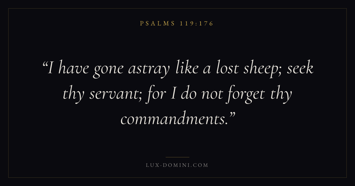 Books / Psalms / Chapter 119 / Verse 176 ← Psalms 119:175 Psalms 119:176 Psalms 120:1 → I have gone astray like a lost sheep; seek thy servant; for I do not forget thy commandments. Download verse card Share on Twitter Share on Facebook Pin it ✦ Key themes FaithPrayerGraceTruthPraise Read with Hebrews 11:1Romans 10:17Matthew 6:9Luke 18:1 Related topics Bible verses about faithBible verses about prayerBible verses about graceBible verses about truthBible verses about thankfulness and gratitude ✦ Psalms Chapter 119 verses V. 1 V. 2 V. 3 V. 4 V. 5 V. 6 V. 7 V. 8 V. 9 V. 10 V. 11 V. 12 V. 13 V. 14 V. 15 V. 16 V. 17 V. 18 V. 19 V. 20 V. 21 V. 22 V. 23 V. 24 V. 25 V. 26 V. 27 V. 28 V. 29 V. 30 V. 31 V. 32 V. 33 V. 34 V. 35 V. 36 V. 37 V. 38 V. 39 V. 40 V. 41 V. 42 V. 43 V. 44 V. 45 V. 46 V. 47 V. 48 V. 49 V. 50 V. 51 V. 52 V. 53 V. 54 V. 55 V. 56 V. 57 V. 58 V. 59 V. 60 V. 61 V. 62 V. 63 V. 64 V. 65 V. 66 V. 67 V. 68 V. 69 V. 70 V. 71 V. 72 V. 73 V. 74 V. 75 V. 76 V. 77 V. 78 V. 79 V. 80 V. 81 V. 82 V. 83 V. 84 V. 85 V. 86 V. 87 V. 88 V. 89 V. 90 V. 91 V. 92 V. 93 V. 94 V. 95 V. 96 V. 97 V. 98 V. 99 V. 100 V. 101 V. 102 V. 103 V. 104 V. 105 V. 106 V. 107 V. 108 V. 109 V. 110 V. 111 V. 112 V. 113 V. 114 V. 115 V. 116 V. 117 V. 118 V. 119 V. 120 V. 121 V. 122 V. 123 V. 124 V. 125 V. 126 V. 127 V. 128 V. 129 V. 130 V. 131 V. 132 V. 133 V. 134 V. 135 V. 136 V. 137 V. 138 V. 139 V. 140 V. 141 V. 142 V. 143 V. 144 V. 145 V. 146 V. 147 V. 148 V. 149 V. 150 V. 151 V. 152 V. 153 V. 154 V. 155 V. 156 V. 157 V. 158 V. 159 V. 160 V. 161 V. 162 V. 163 V. 164 V. 165 V. 166 V. 167 V. 168 V. 169 V. 170 V. 171 V. 172 V. 173 V. 174 V. 175 V. 176