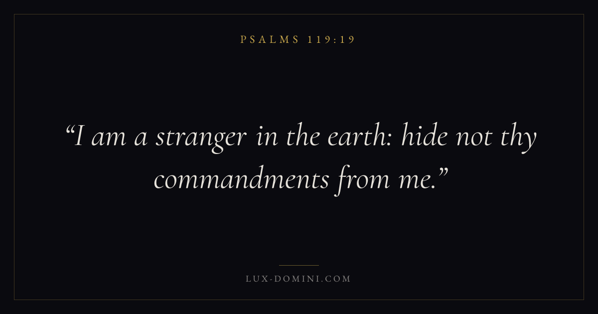 Books / Psalms / Chapter 119 / Verse 19 ← Psalms 119:18 Psalms 119:19 Psalms 119:20 → I am a stranger in the earth: hide not thy commandments from me. Download verse card Share on Twitter Share on Facebook Pin it ✦ Key themes FaithPrayerJustice and mercyTruthPraise Read with Hebrews 11:1Romans 10:17Matthew 6:9Luke 18:1 Related topics Bible verses about faithBible verses about prayerBible verses about justice and mercyBible verses about truthBible verses about thankfulness and gratitude ✦ Psalms Chapter 119 verses V. 1 V. 2 V. 3 V. 4 V. 5 V. 6 V. 7 V. 8 V. 9 V. 10 V. 11 V. 12 V. 13 V. 14 V. 15 V. 16 V. 17 V. 18 V. 19 V. 20 V. 21 V. 22 V. 23 V. 24 V. 25 V. 26 V. 27 V. 28 V. 29 V. 30 V. 31 V. 32 V. 33 V. 34 V. 35 V. 36 V. 37 V. 38 V. 39 V. 40 V. 41 V. 42 V. 43 V. 44 V. 45 V. 46 V. 47 V. 48 V. 49 V. 50 V. 51 V. 52 V. 53 V. 54 V. 55 V. 56 V. 57 V. 58 V. 59 V. 60 V. 61 V. 62 V. 63 V. 64 V. 65 V. 66 V. 67 V. 68 V. 69 V. 70 V. 71 V. 72 V. 73 V. 74 V. 75 V. 76 V. 77 V. 78 V. 79 V. 80 V. 81 V. 82 V. 83 V. 84 V. 85 V. 86 V. 87 V. 88 V. 89 V. 90 V. 91 V. 92 V. 93 V. 94 V. 95 V. 96 V. 97 V. 98 V. 99 V. 100 V. 101 V. 102 V. 103 V. 104 V. 105 V. 106 V. 107 V. 108 V. 109 V. 110 V. 111 V. 112 V. 113 V. 114 V. 115 V. 116 V. 117 V. 118 V. 119 V. 120 V. 121 V. 122 V. 123 V. 124 V. 125 V. 126 V. 127 V. 128 V. 129 V. 130 V. 131 V. 132 V. 133 V. 134 V. 135 V. 136 V. 137 V. 138 V. 139 V. 140 V. 141 V. 142 V. 143 V. 144 V. 145 V. 146 V. 147 V. 148 V. 149 V. 150 V. 151 V. 152 V. 153 V. 154 V. 155 V. 156 V. 157 V. 158 V. 159 V. 160 V. 161 V. 162 V. 163 V. 164 V. 165 V. 166 V. 167 V. 168 V. 169 V. 170 V. 171 V. 172 V. 173 V. 174 V. 175 V. 176